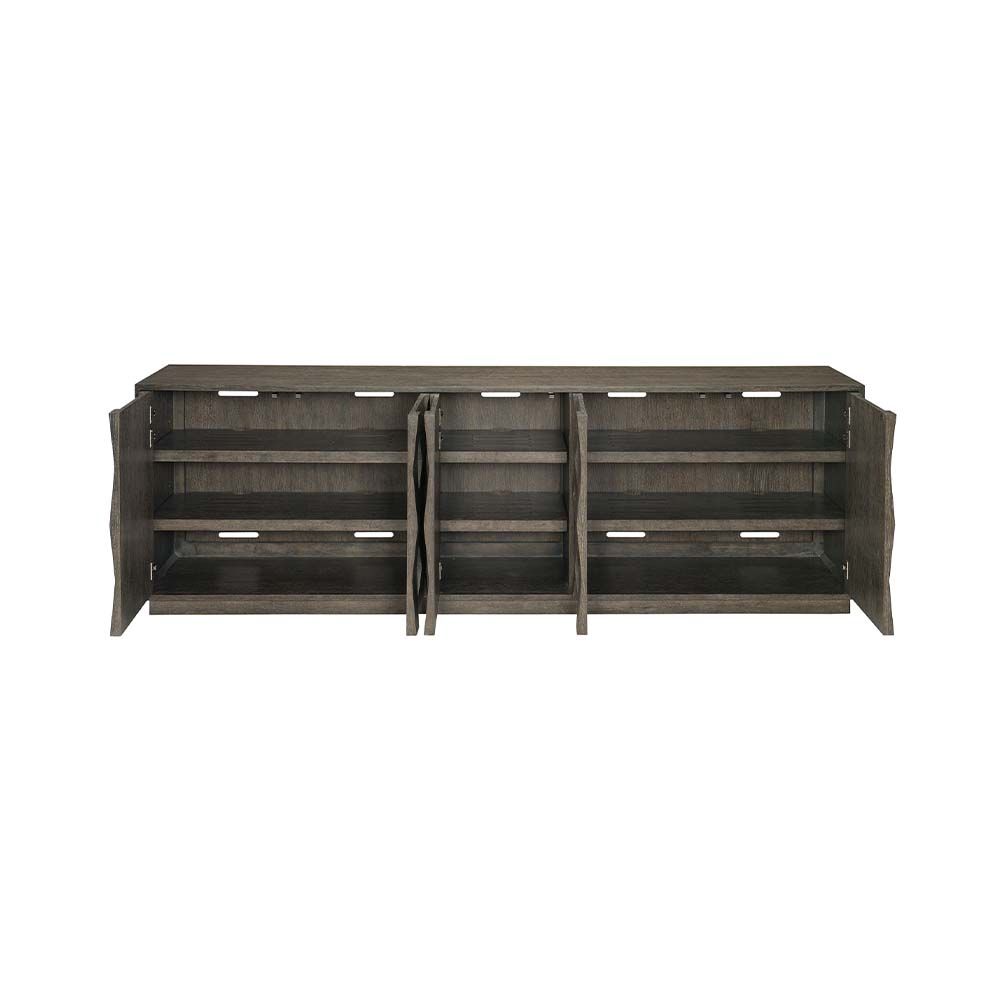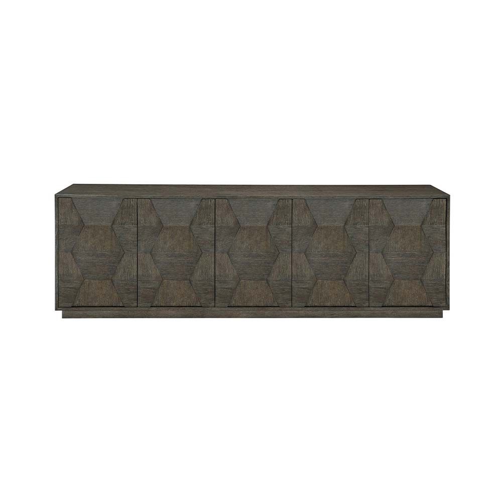 A darker finish on this entertainment unit makes it the perfect piece for any modern home. An exquisite alternating depth is used to create the front panels of the doors, making it a carpentry masterpiece. With five push-to-open doors, disguising nine plentiful shelves, it’s a wonderfully sleek item of furniture.