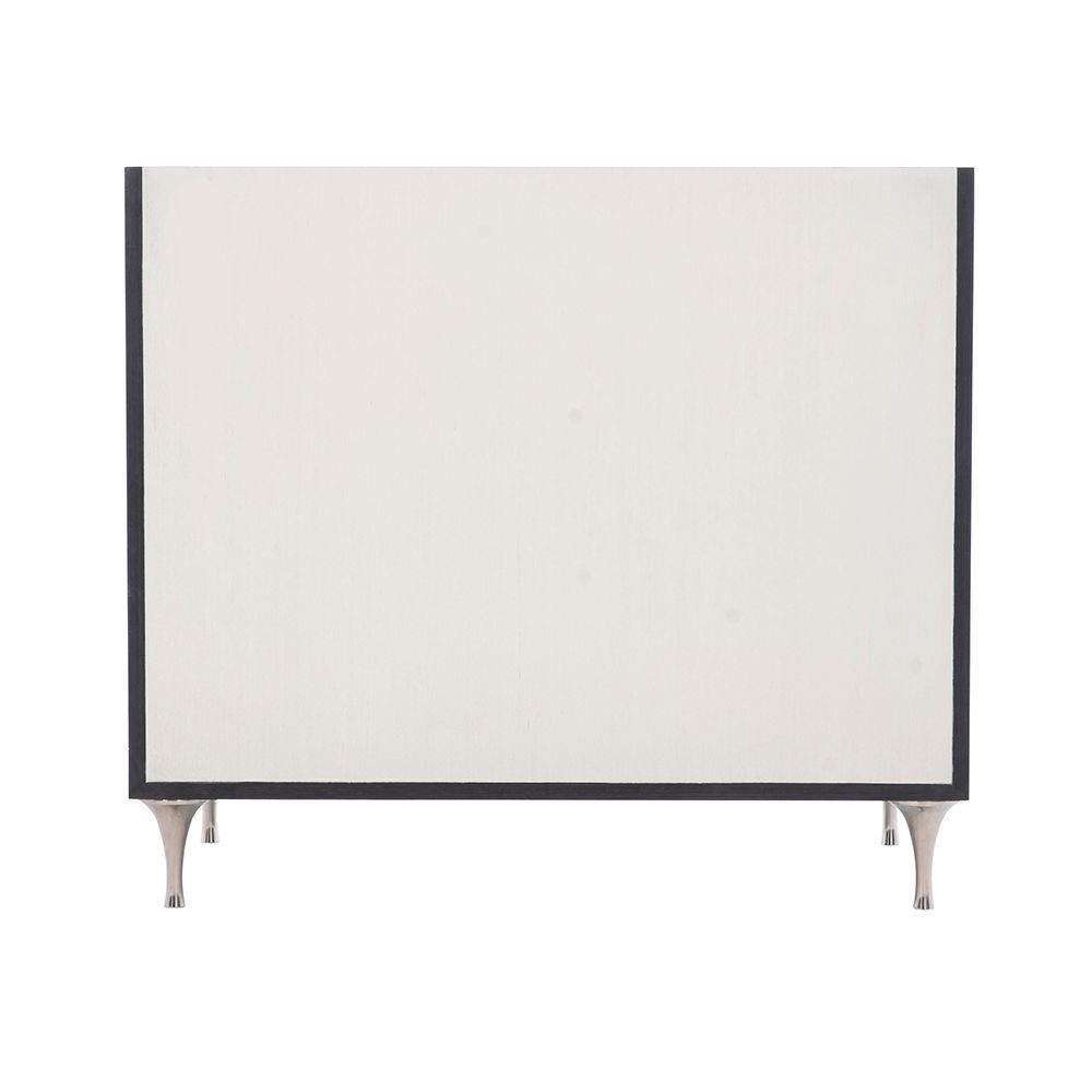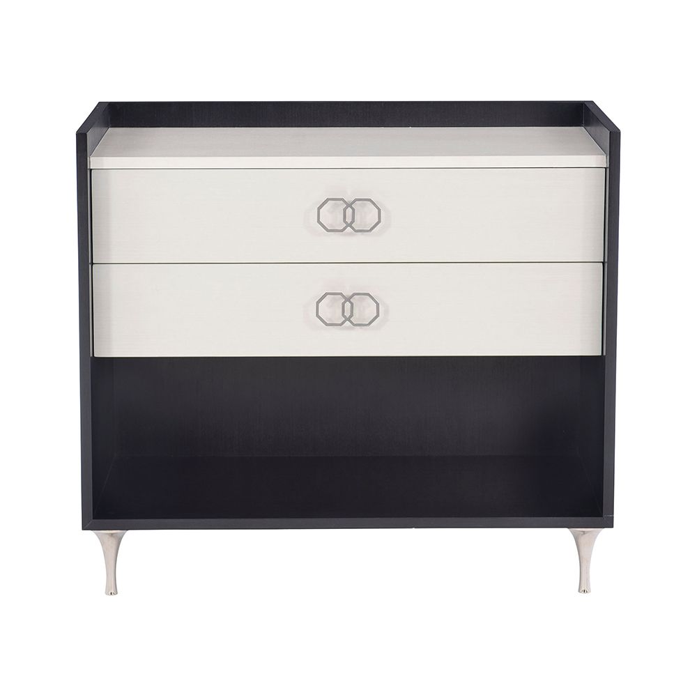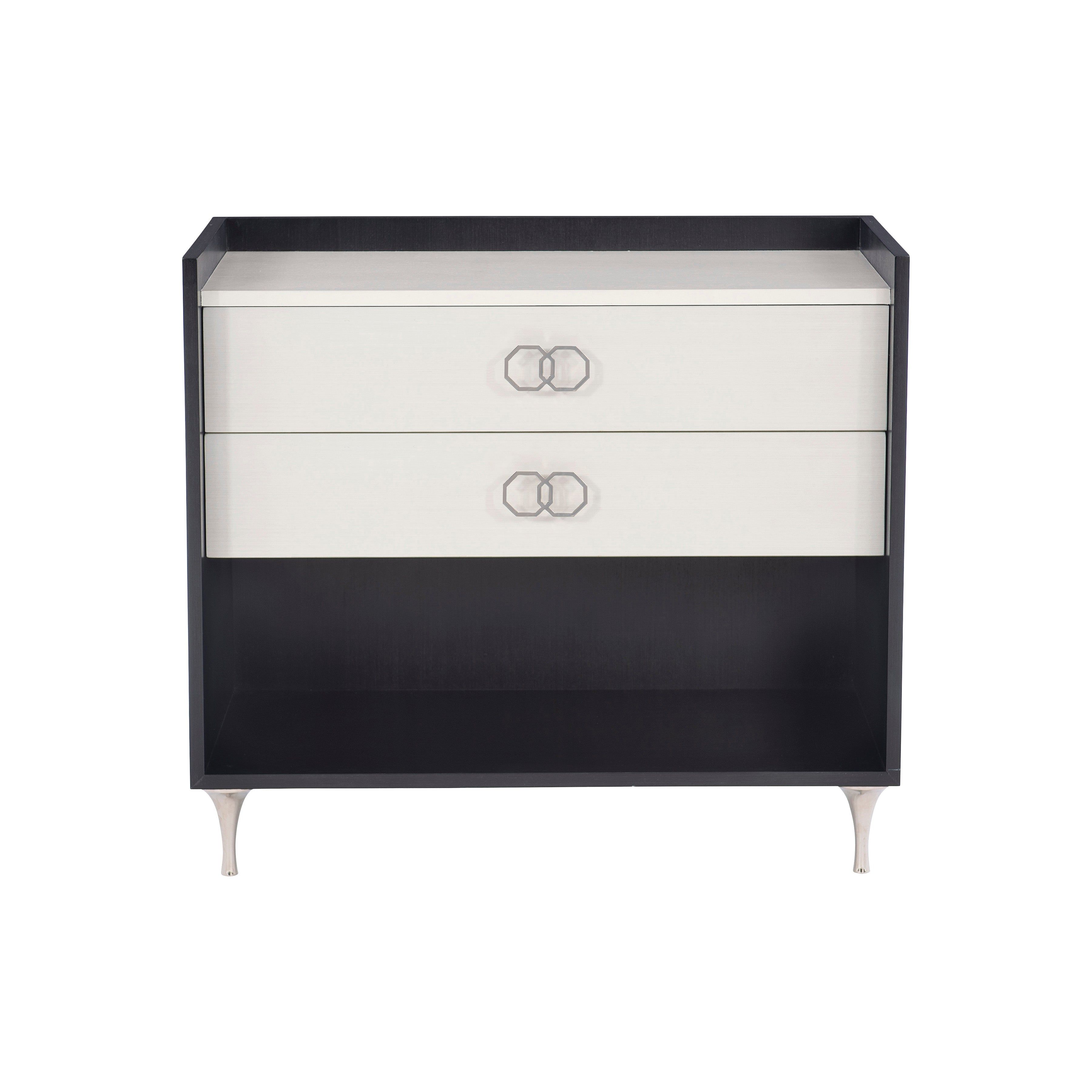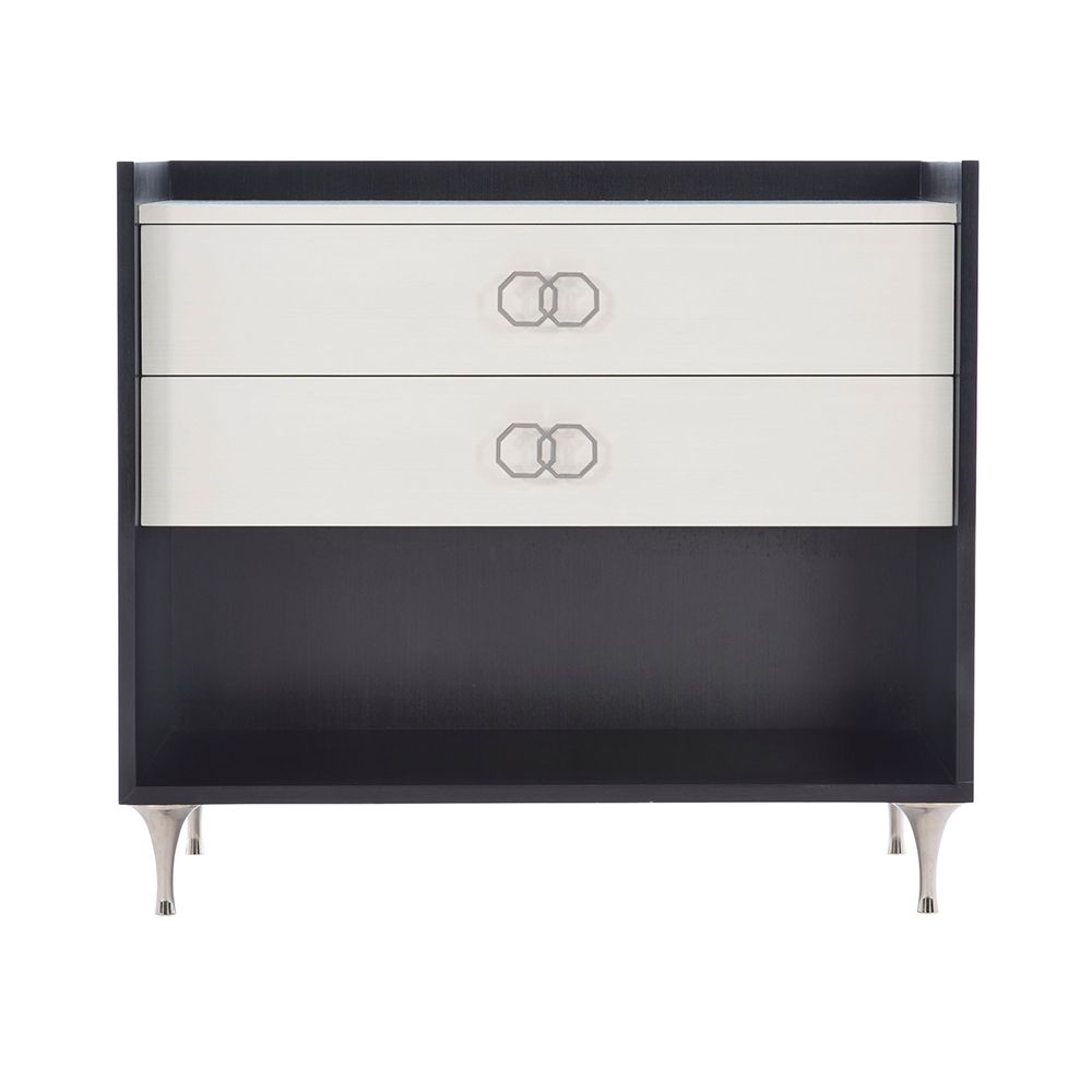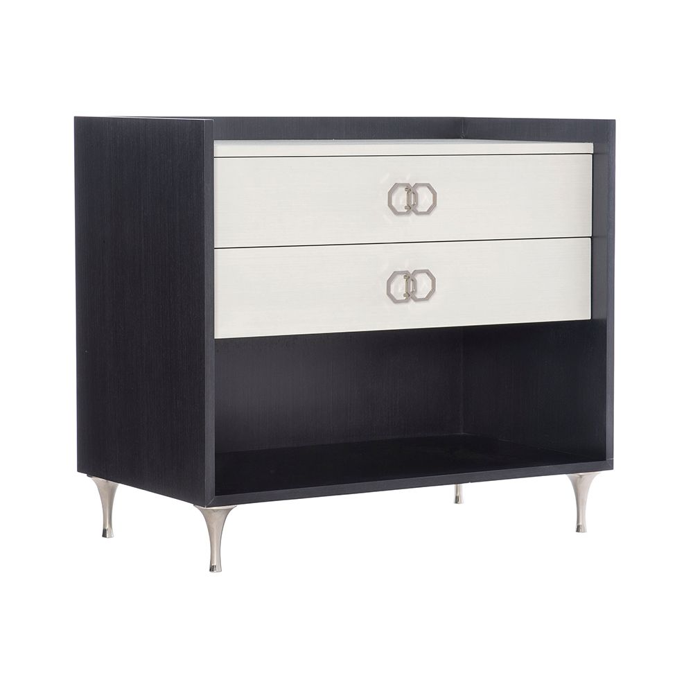 Enhance your lovely bedroom with the sleek and sophisticated Silhouette 2 Drawer Bedside Table from Bernhardt. Featuring a black and cream two-tone finish, two soft closing drawers with unique geometric, octagon shaped pull handles and stainless steel feet. Complete with an open compartment and dual USB port, this piece is just as functional as it is beautiful.