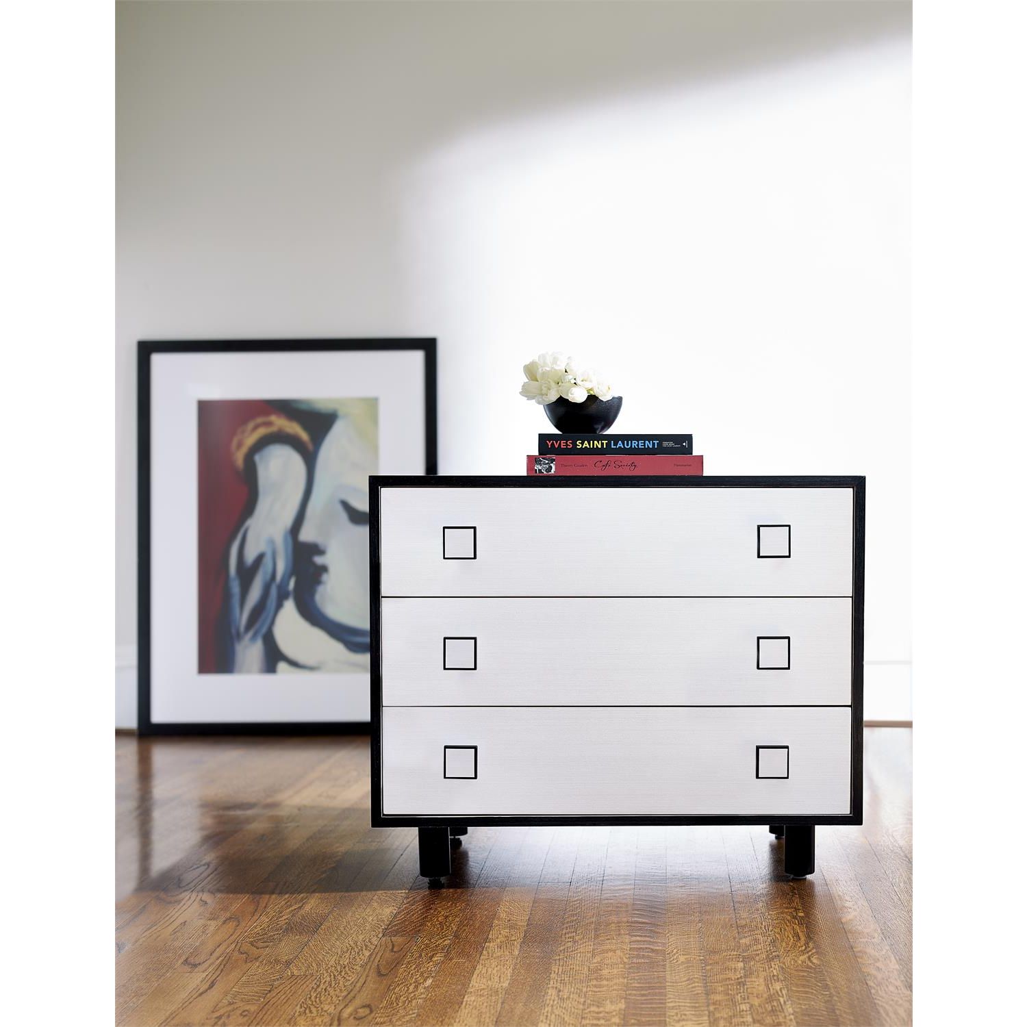 Adorn your bedroom space with the alluring Silhouette 3 Drawer Bedside Table from Bernhardt. This effortlessly stylish piece consists of a beautiful two tone finish and three soft closing doors with sleek wooden knobs. Complete with a dual USB charger, this elegant bedside table is just as functional as it is fabulous.
