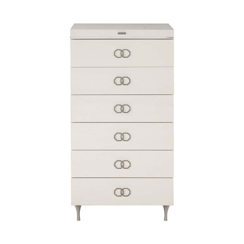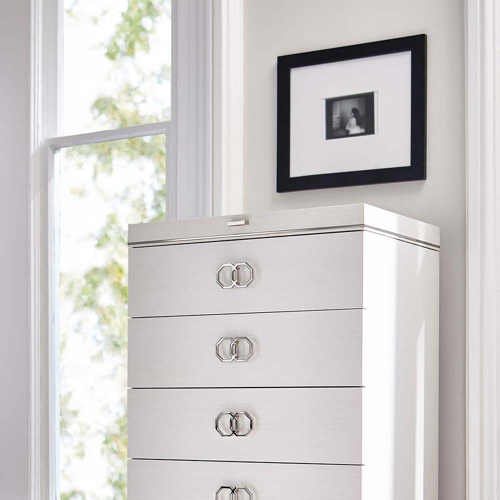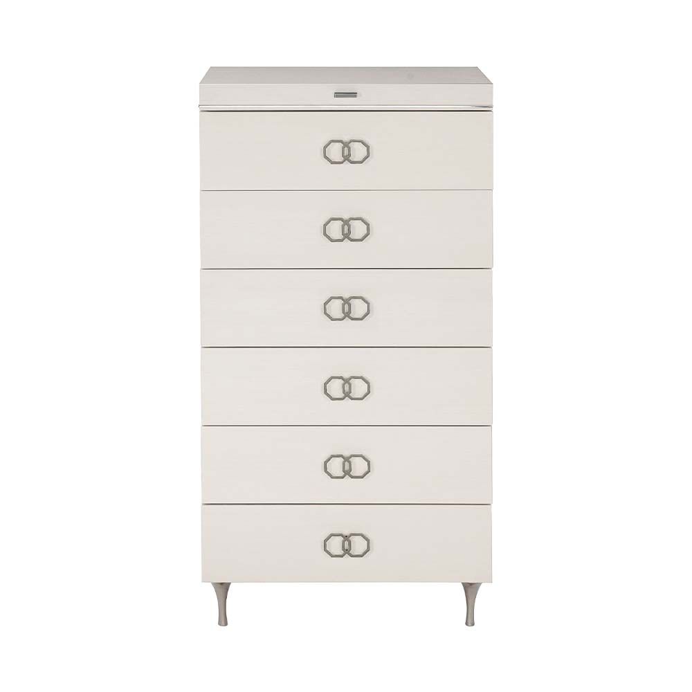 A true delight for your bedroom. Create the essence of opulence with this tallboy that comes with a foldable mirror as well as a gorgeous black felt-lined jewellery tray, perfect for all your accessories! The smaller details, such as the octagonal handles, truly make this piece a gorgeous must-have. Self Assembly Required