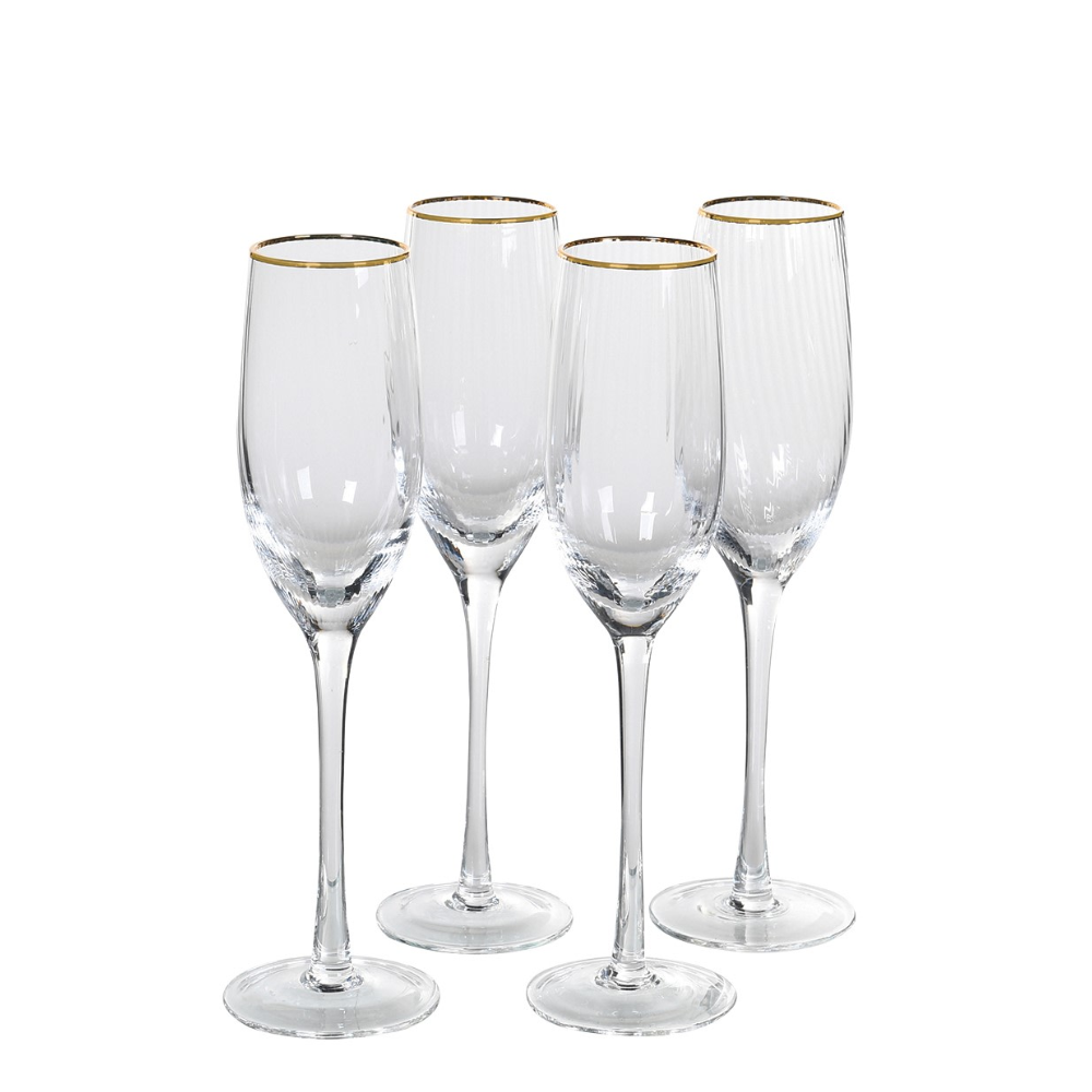 Only two sets remaining. Create an exquisite atmosphere at your next gathering with this glamorous set of 4 gold-rimmed champagne glasses.