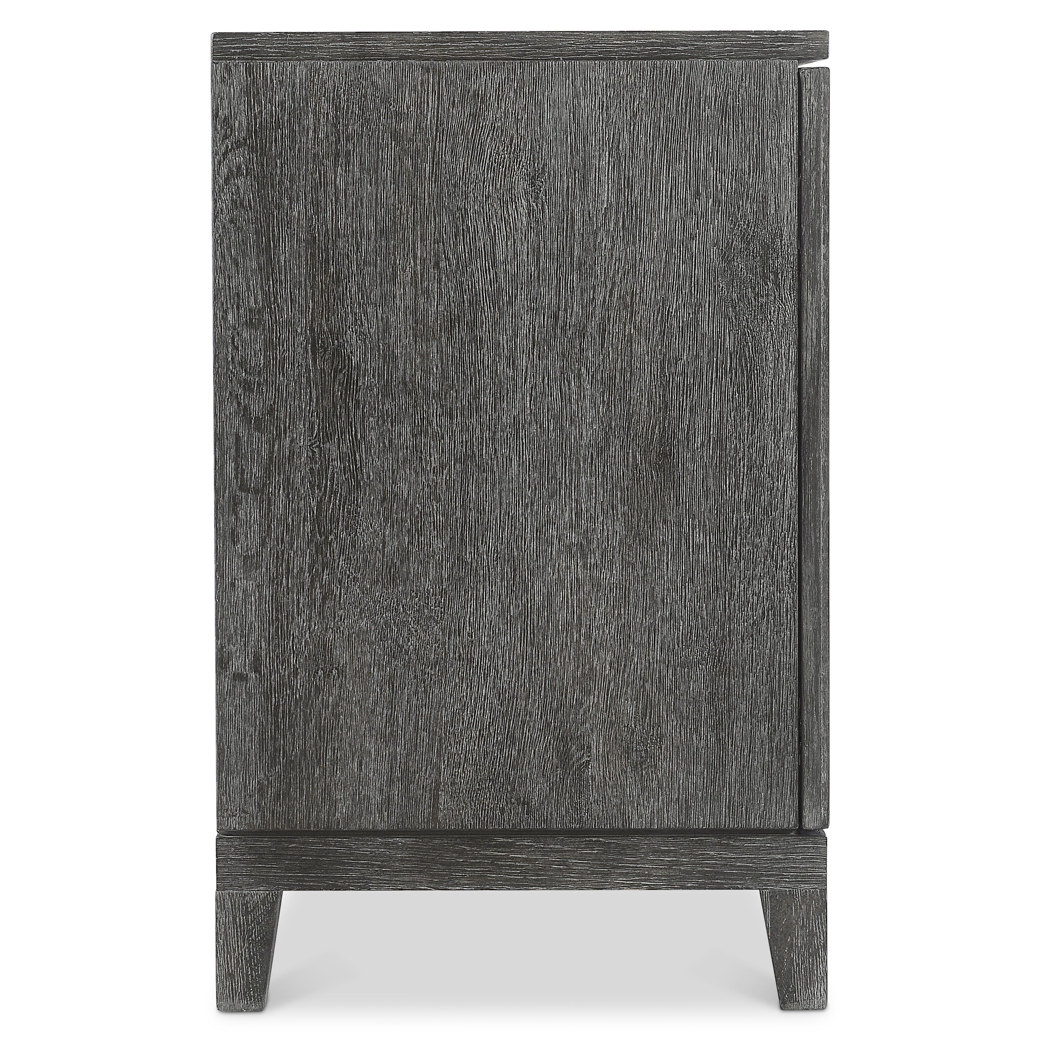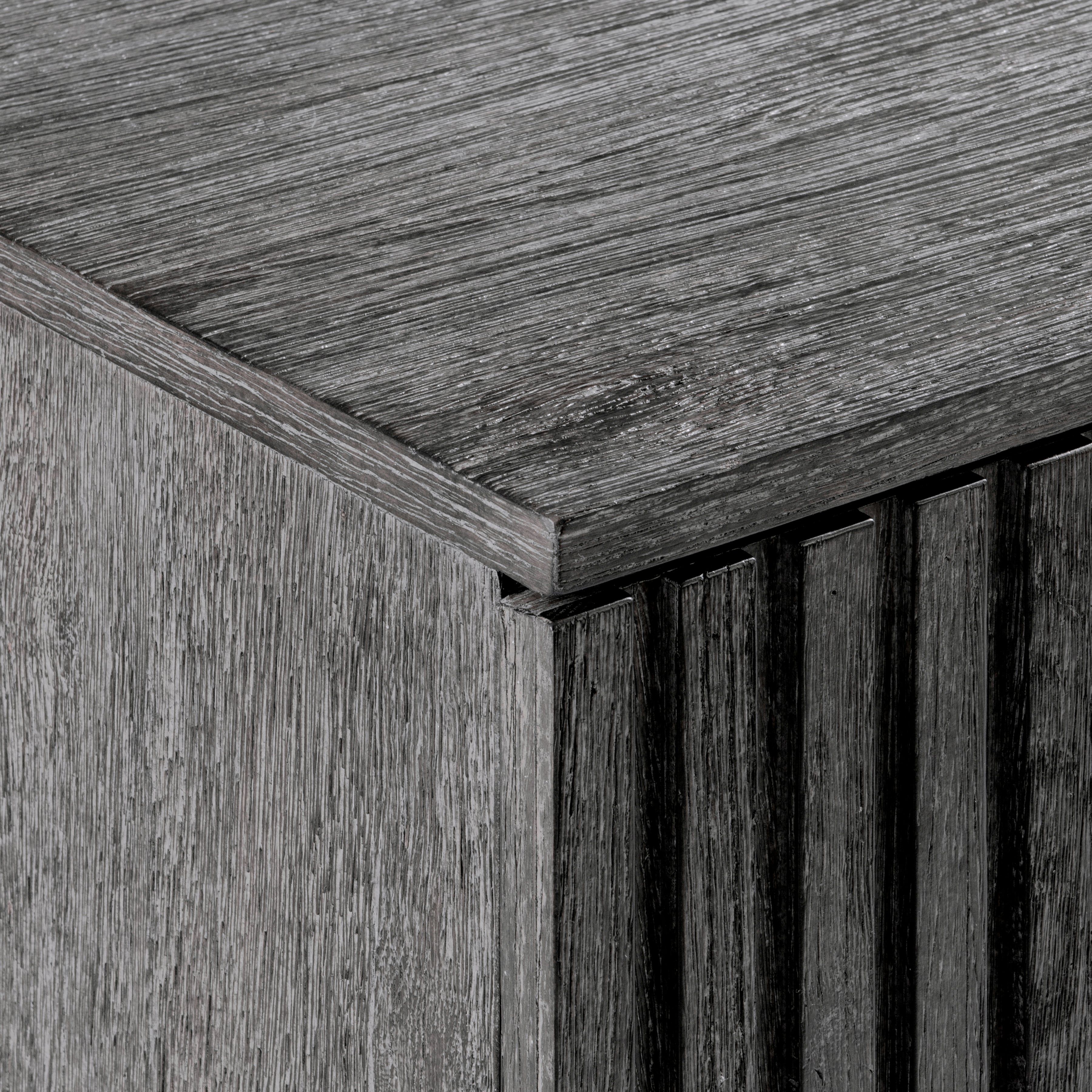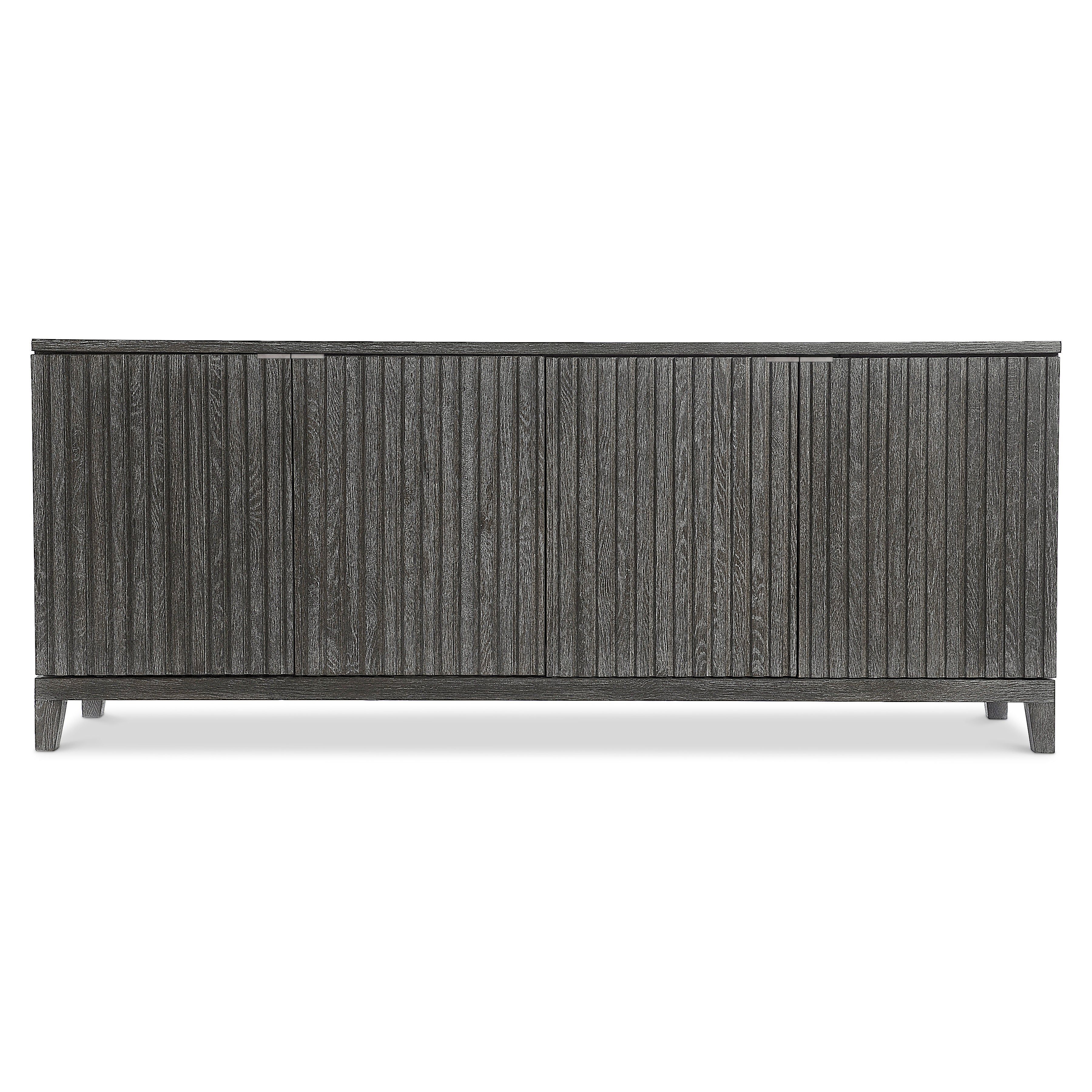 The deeply reeded door fronts on the Menton entertainment credenza craft a visually stunning style that highlights the moody Sutton finish. The four doors have cast aluminum tab pulls and conceal adjustable shelves, grommets and vents. The look is casually rustic and beautifully modern.