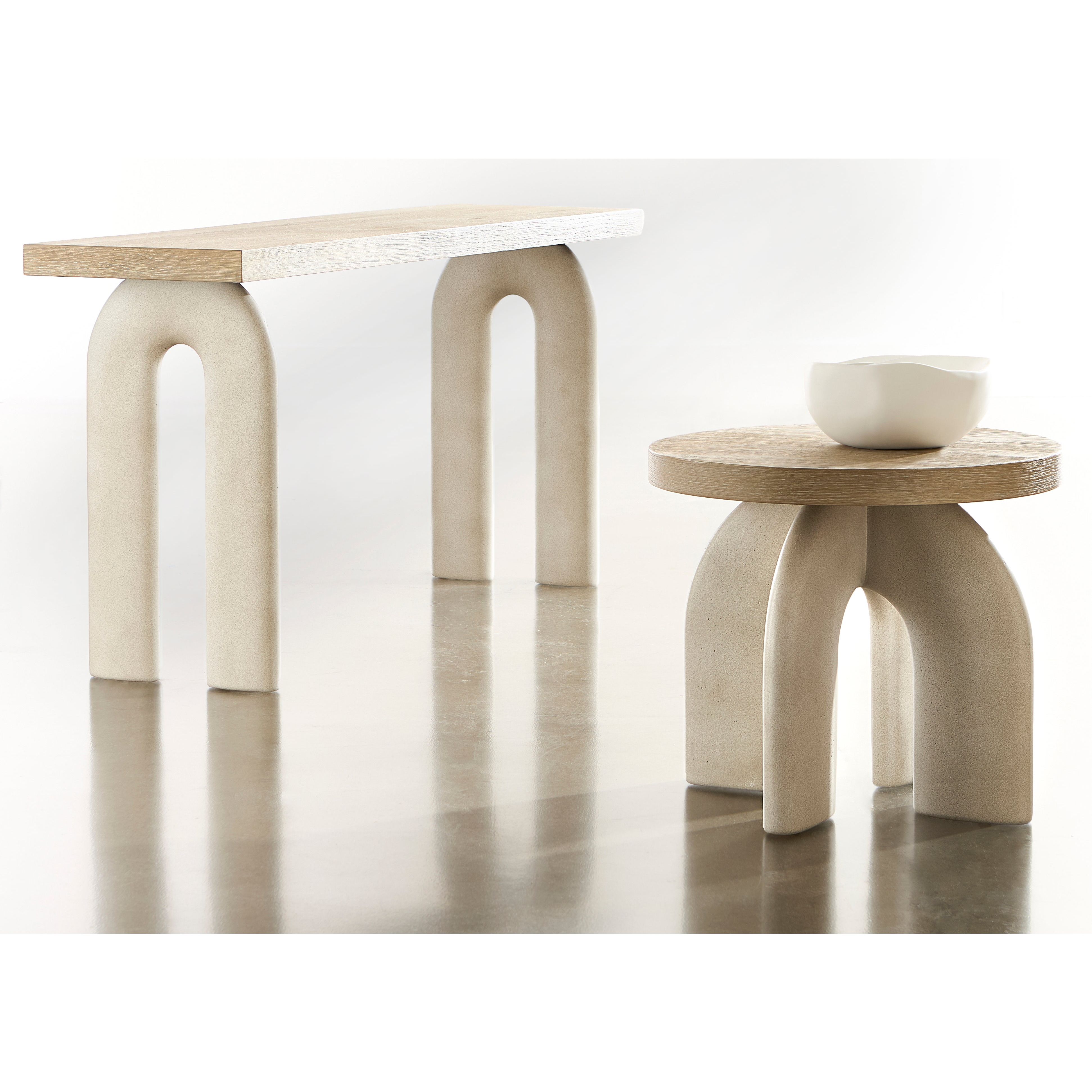 An interlocking sculptural base makes an artistic statement on the Antibes side table. Bisecting arches are crafted from a textural glass-reinforced concrete in a Pumice finish. The base contrasts beautifully with a round wood top in the rustic Roz finish.