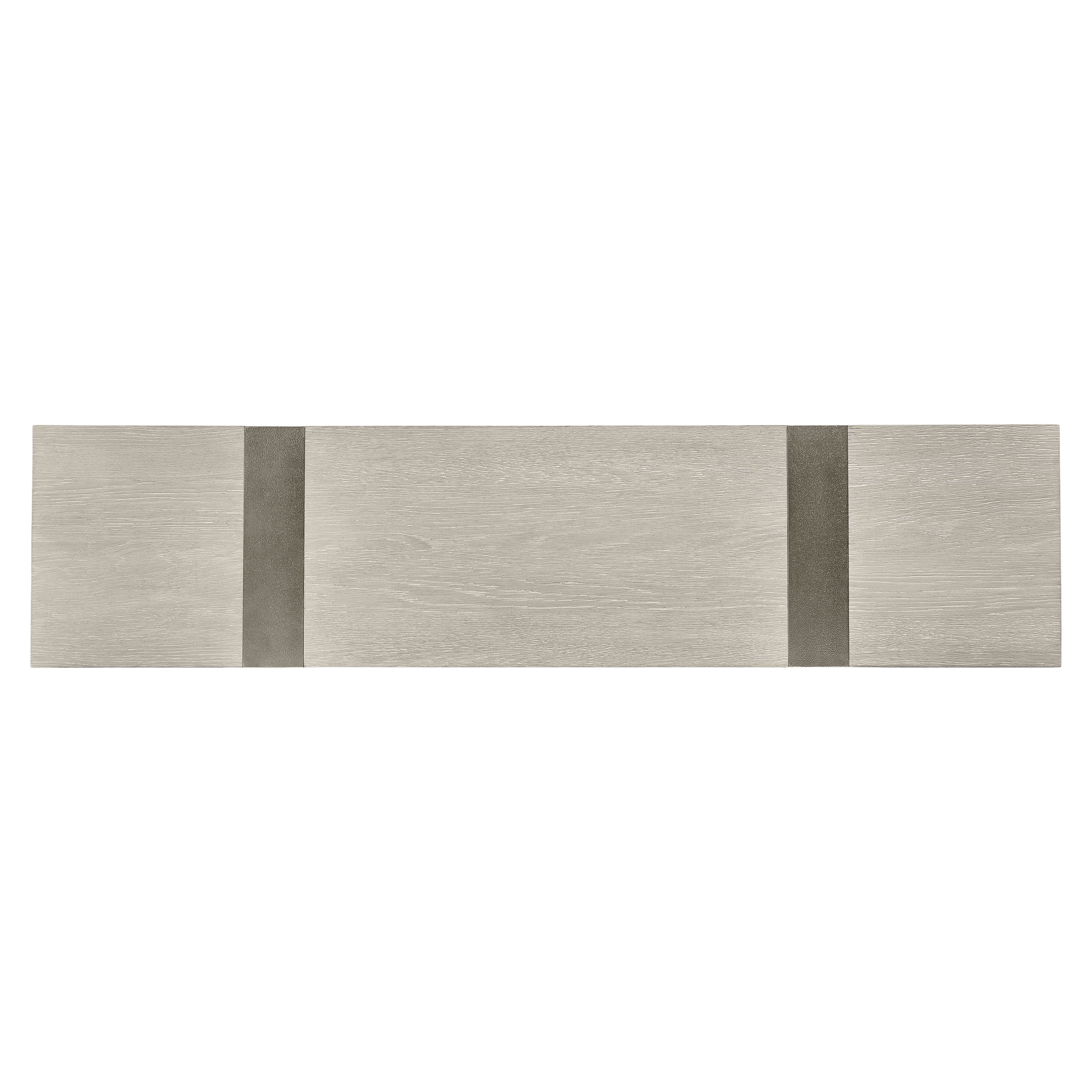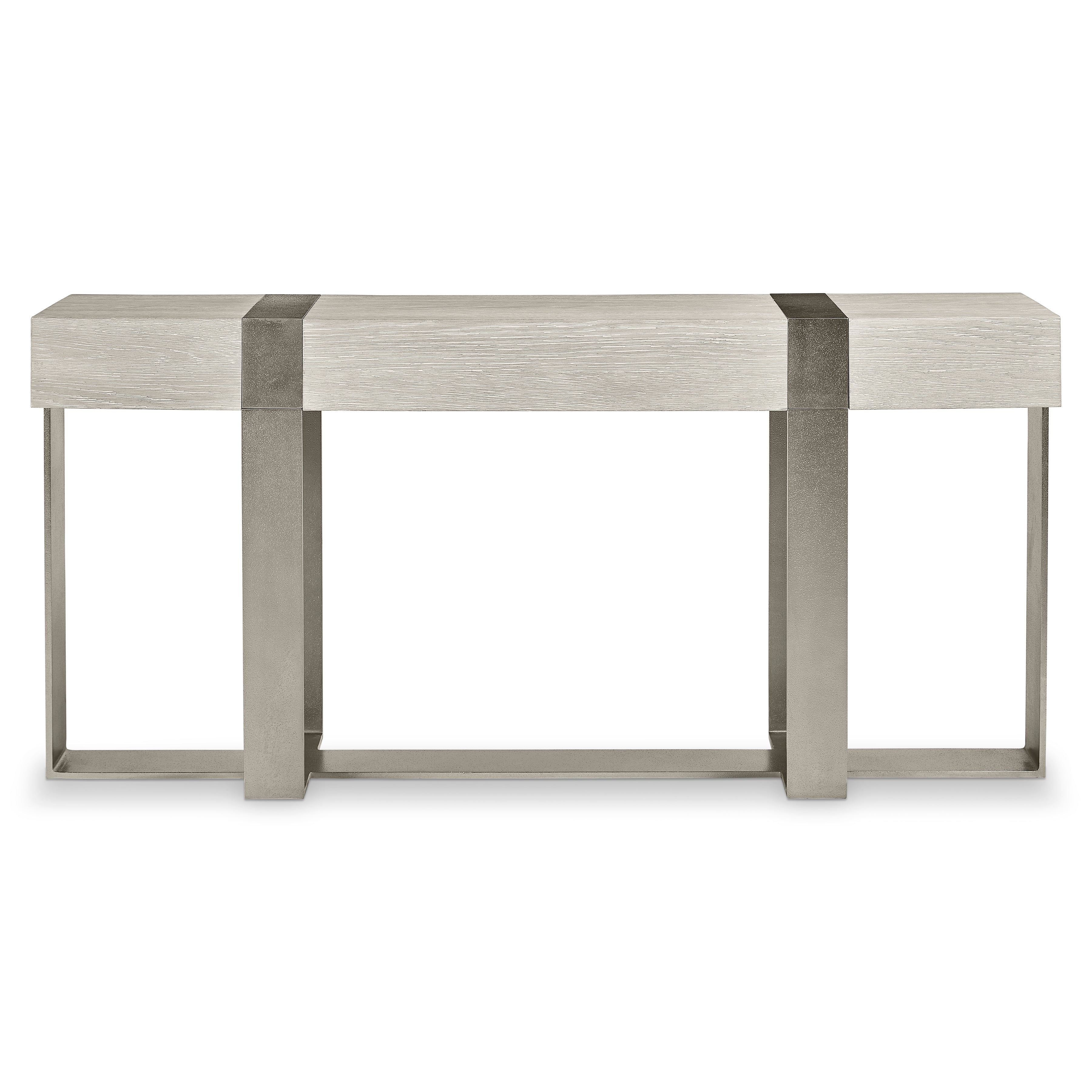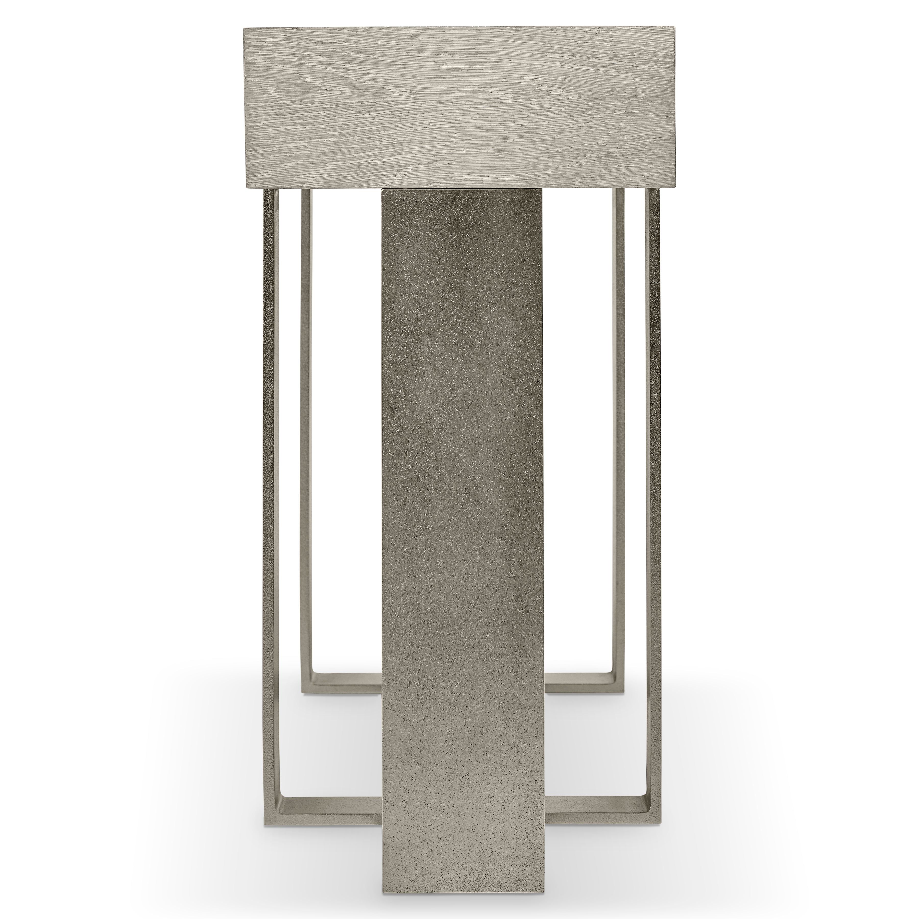 Bands of sandblasted aluminum in Satin Nickel finish intersect to form the base of the Tempo console table. Two bands wrap through the table's top, which is wirebrushed oak in Larza finish. The architectural design is both casual and refined.