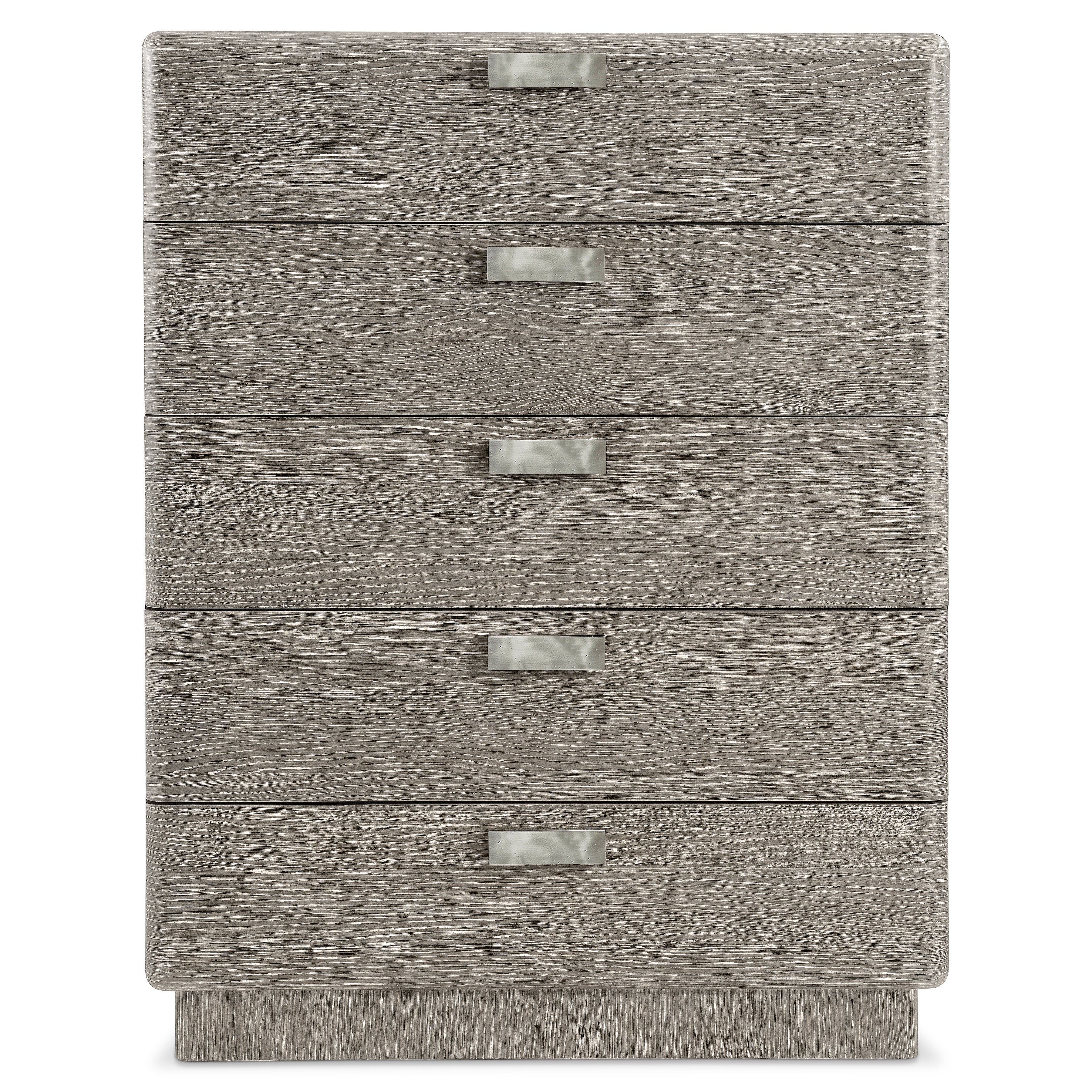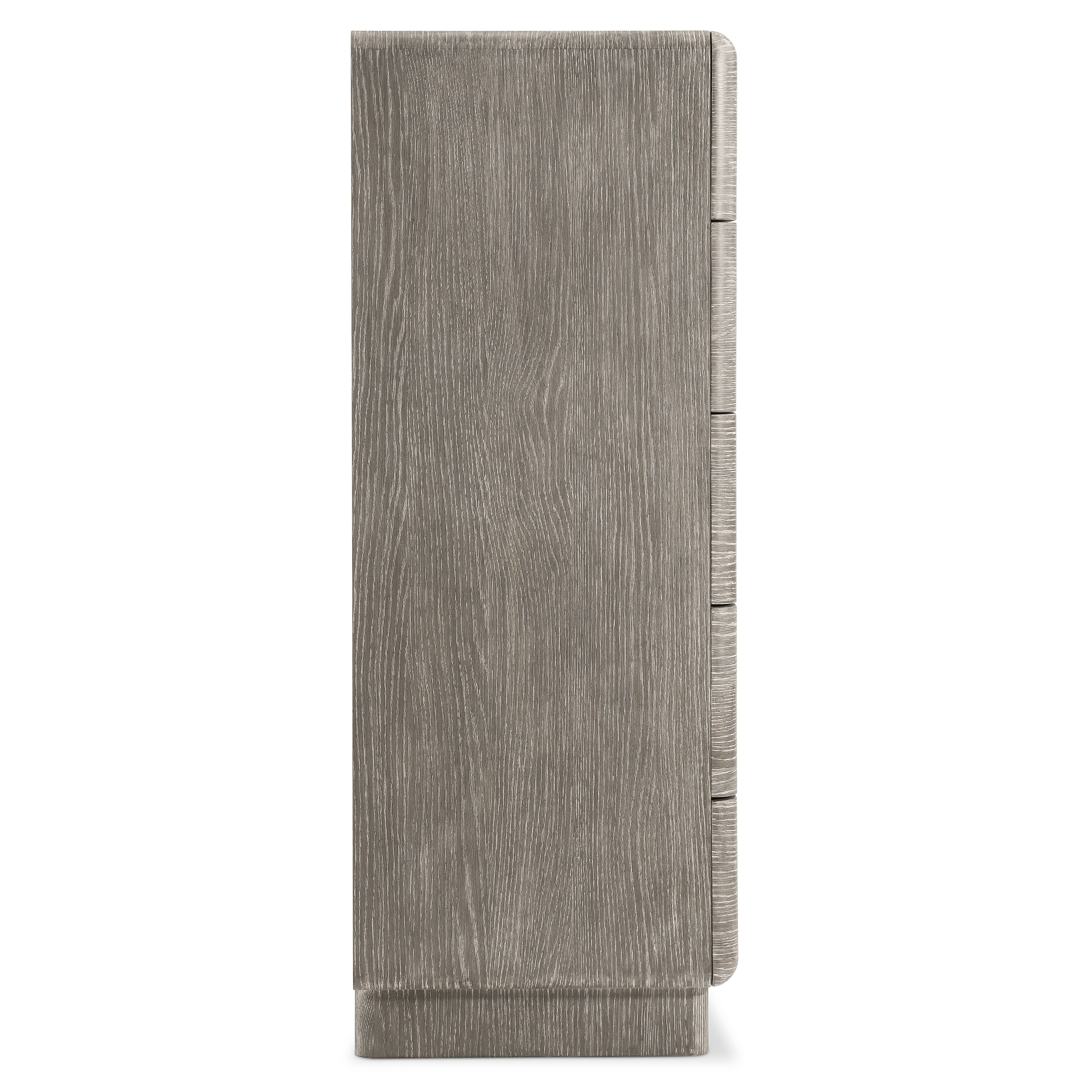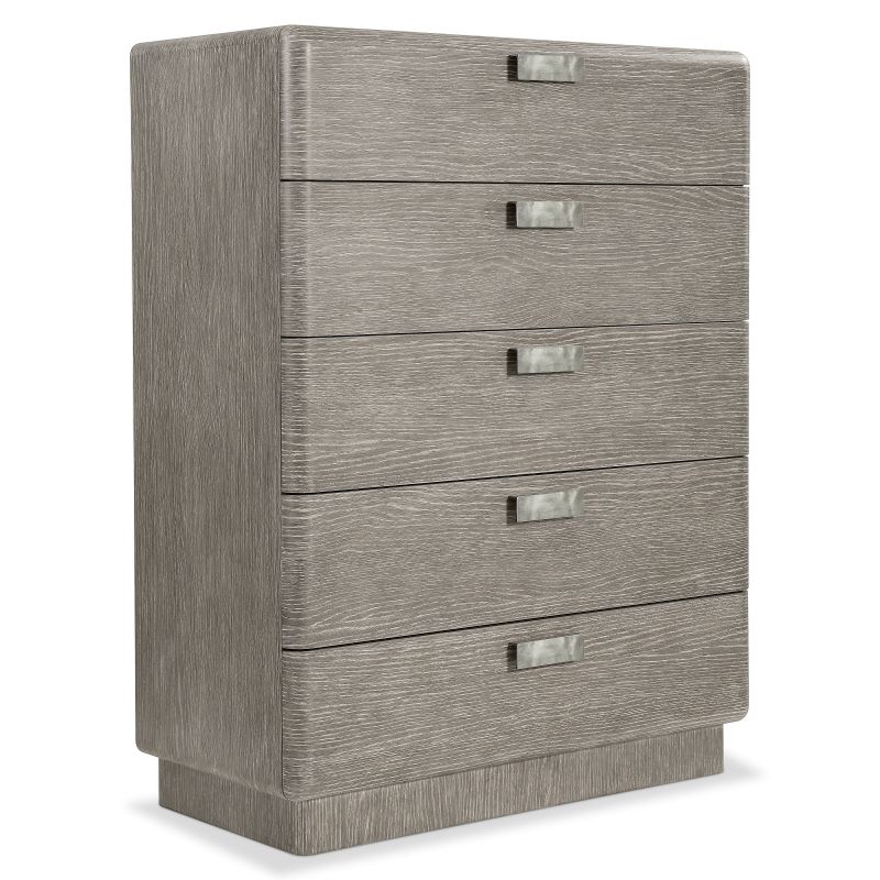 The Monolith tall drawer chest showcases perfect proportions that create a balance of modern and rustic styles. A plinth base supports a bold case that is defined by rounded corners and is finished in Puma. Five soft-close drawers are highlighted by geometric cast aluminum hardware in Graphite finish.