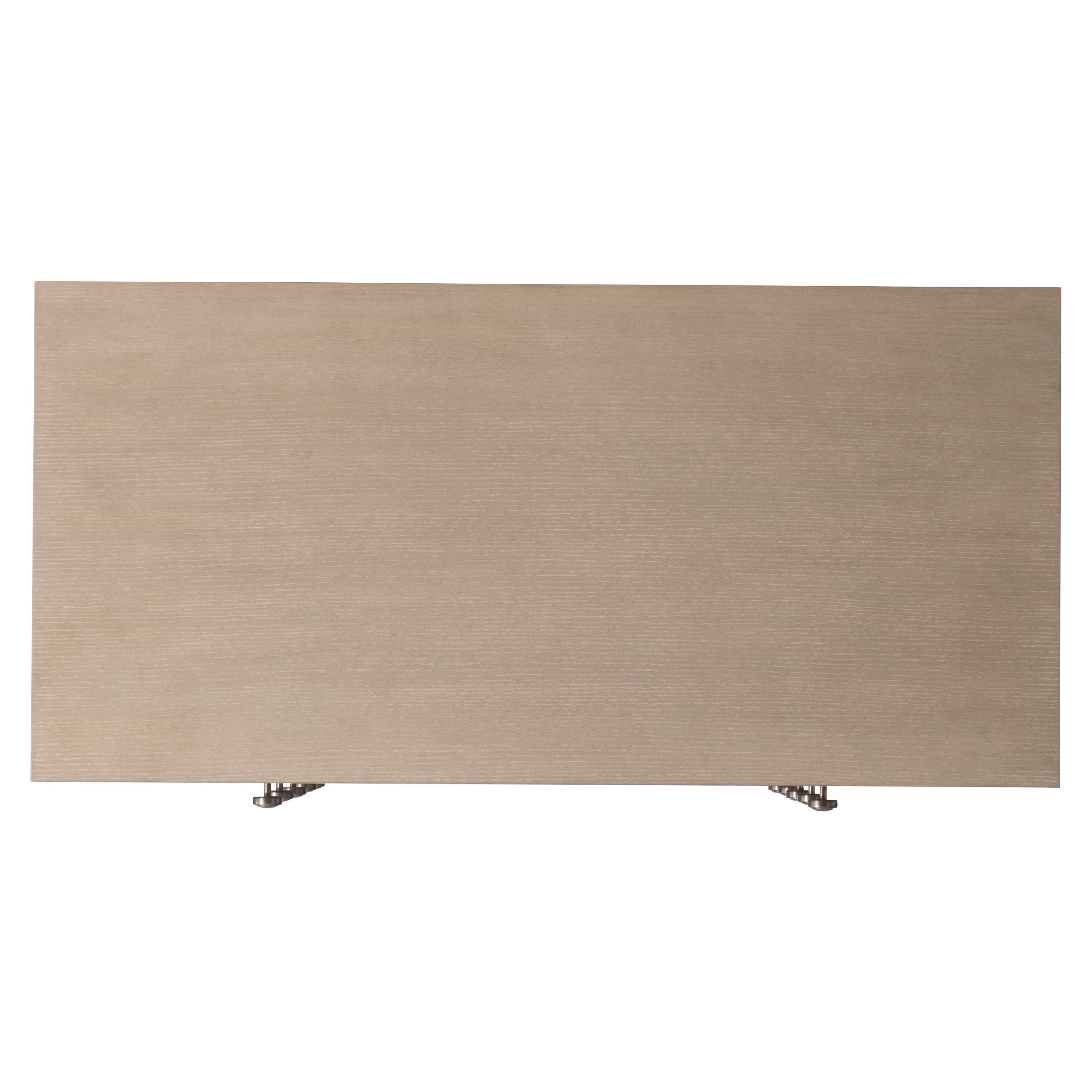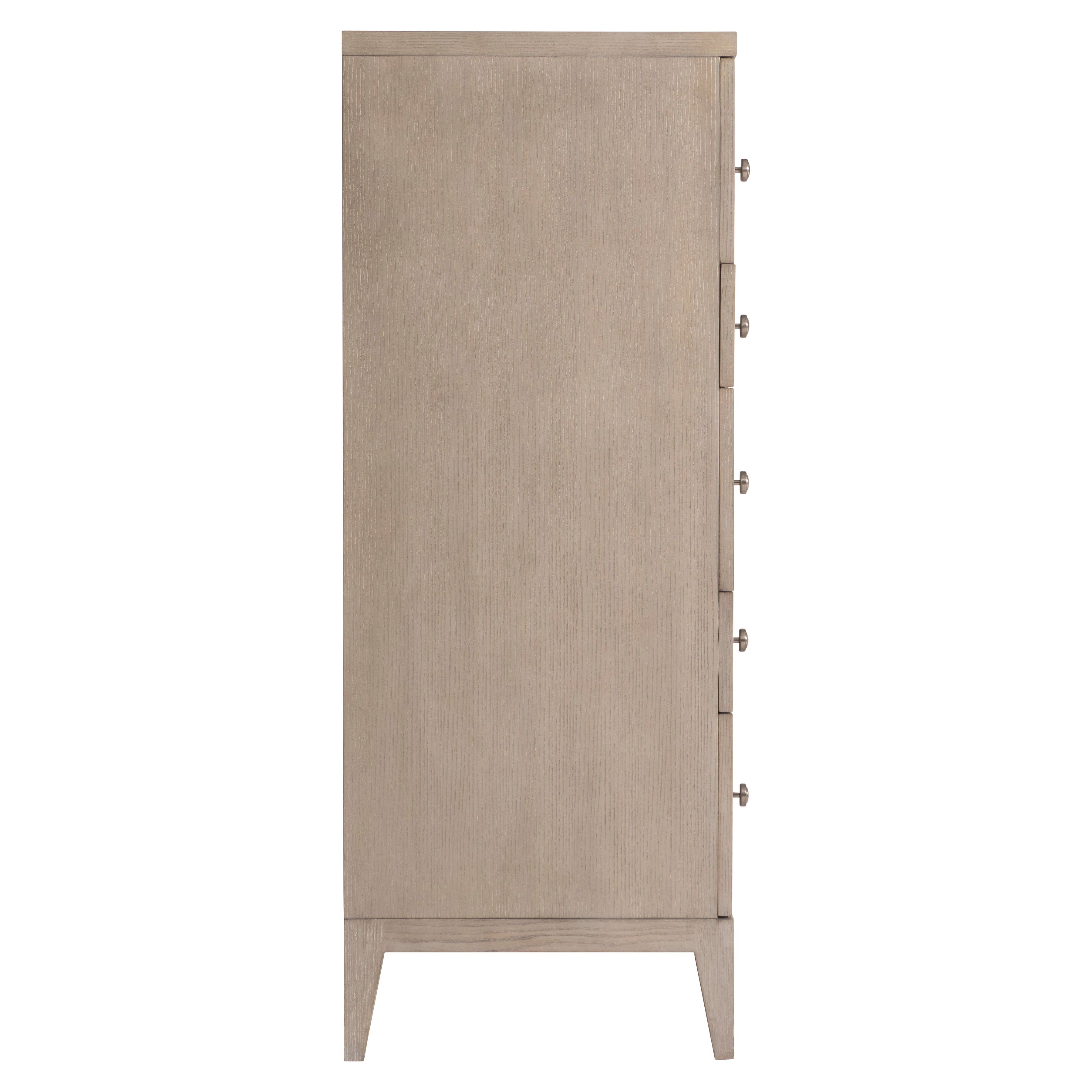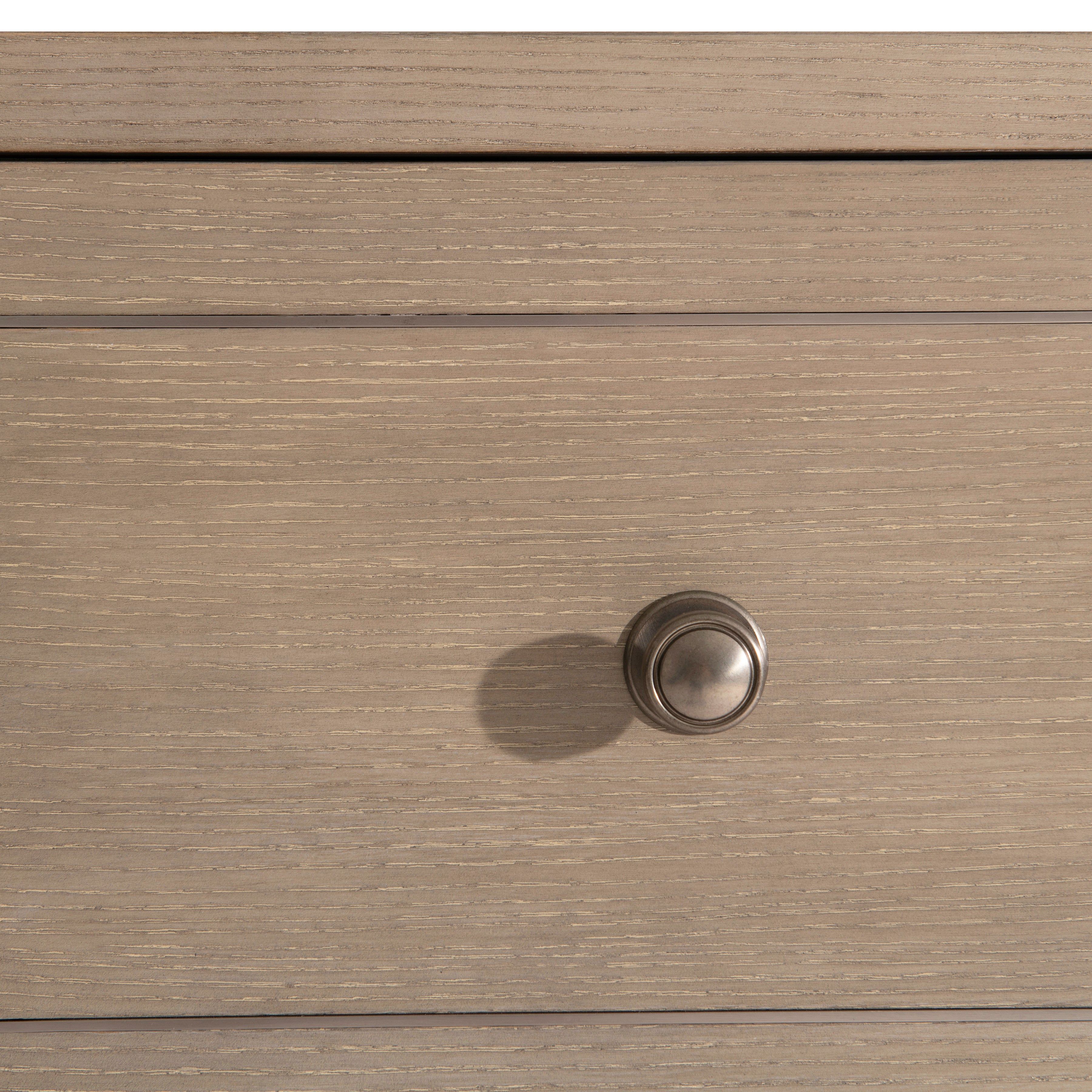 The Cornelia tall drawer chest has a traditional design that is updated for modern living with brushed stainless steel metal inlays around its five drawers. Lines are sleek and refined, while the Nebbia finish gives the piece a more casual style.