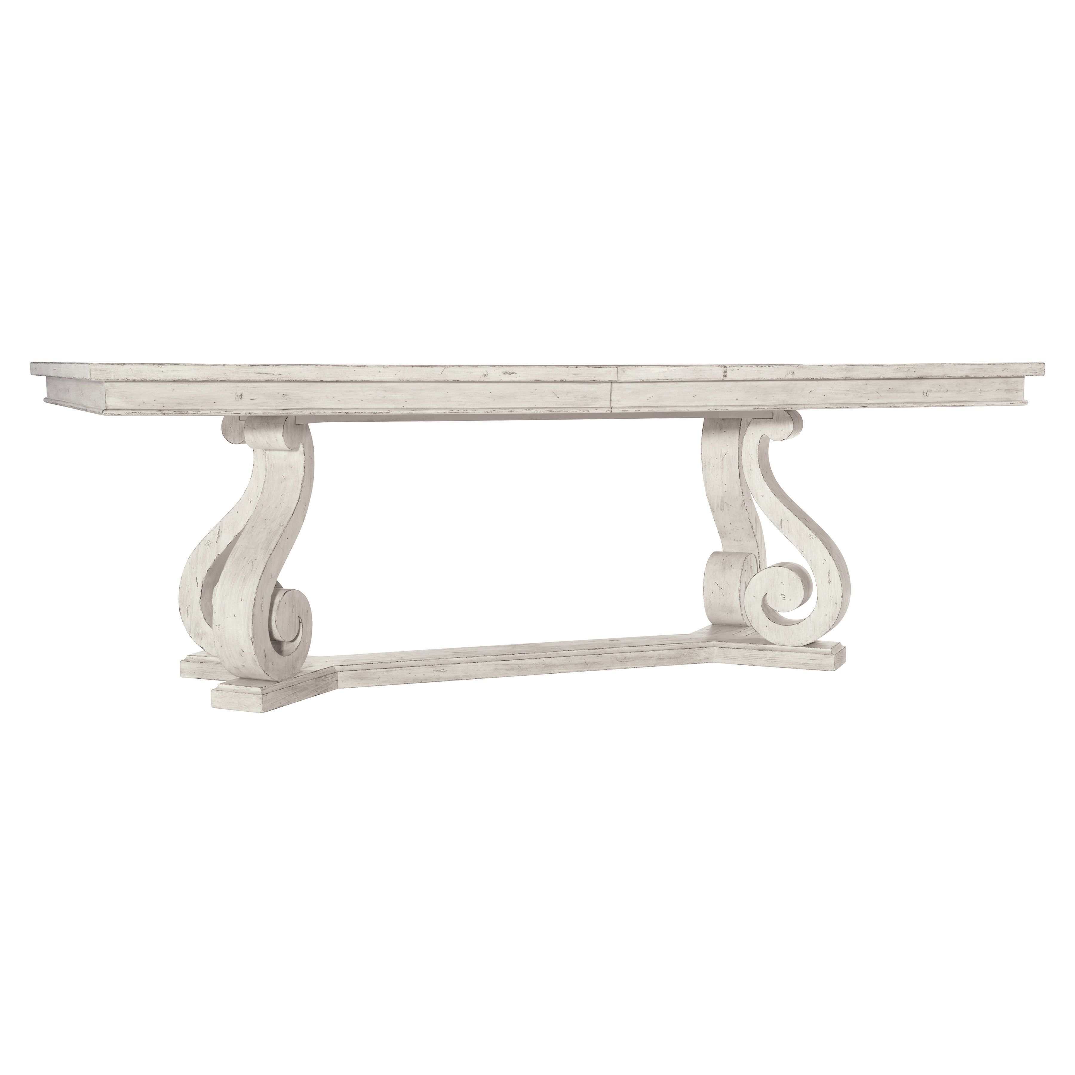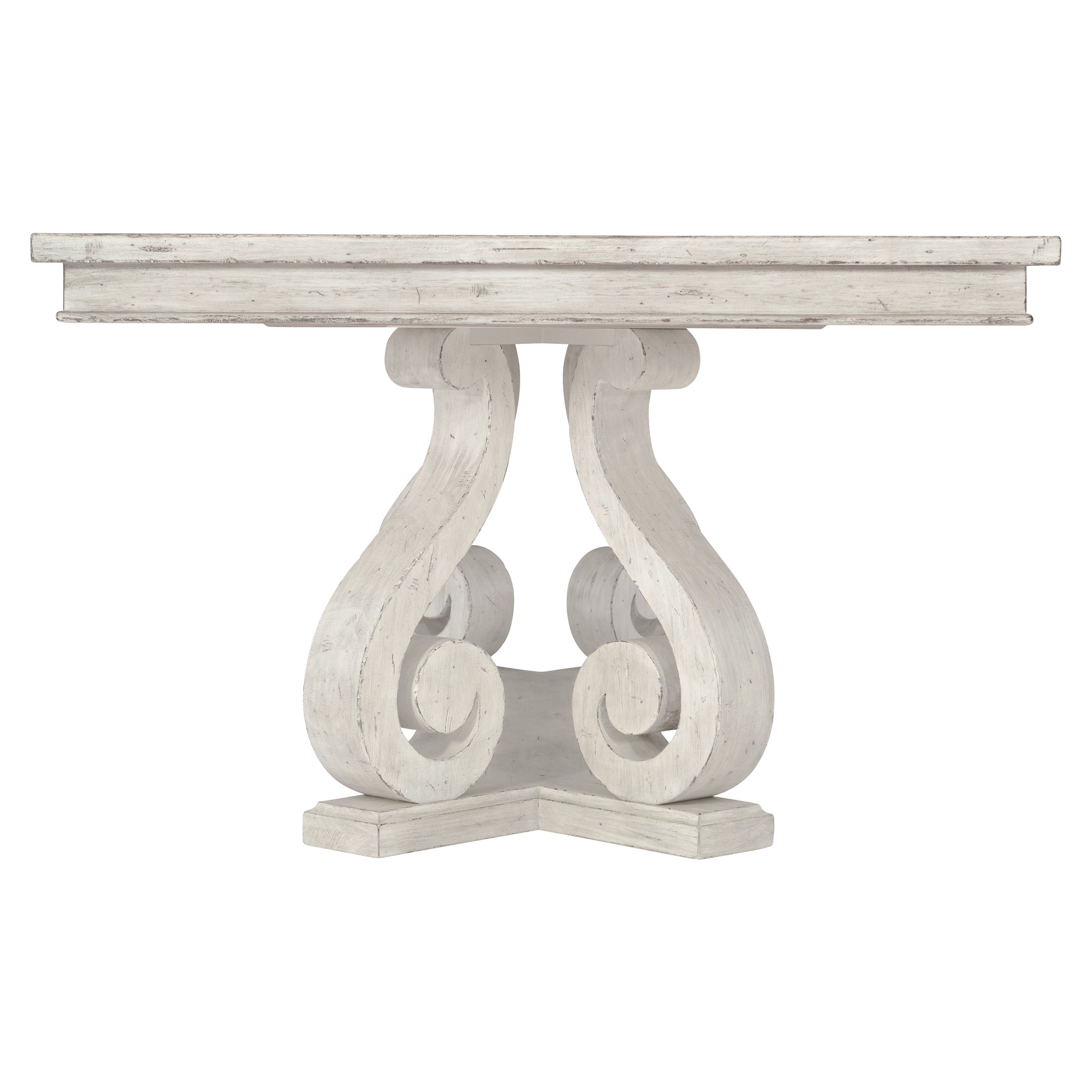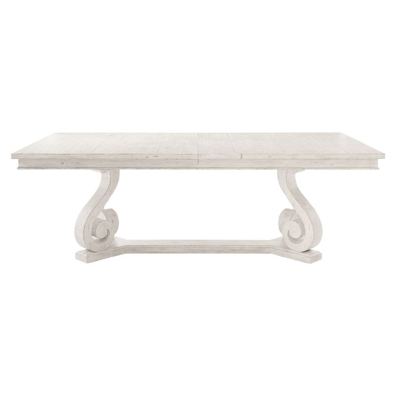 The Mirabelle collection balances traditional forms with casual style. Crafted from wood with a gently worn whitewashed finish, the Mirabelle dining table creates a warm, inviting feel. With a graceful flourish, the ornamental scrolled leg base evokes 17th century French countryside design. Two twenty-inch leaves allow for ample seating.