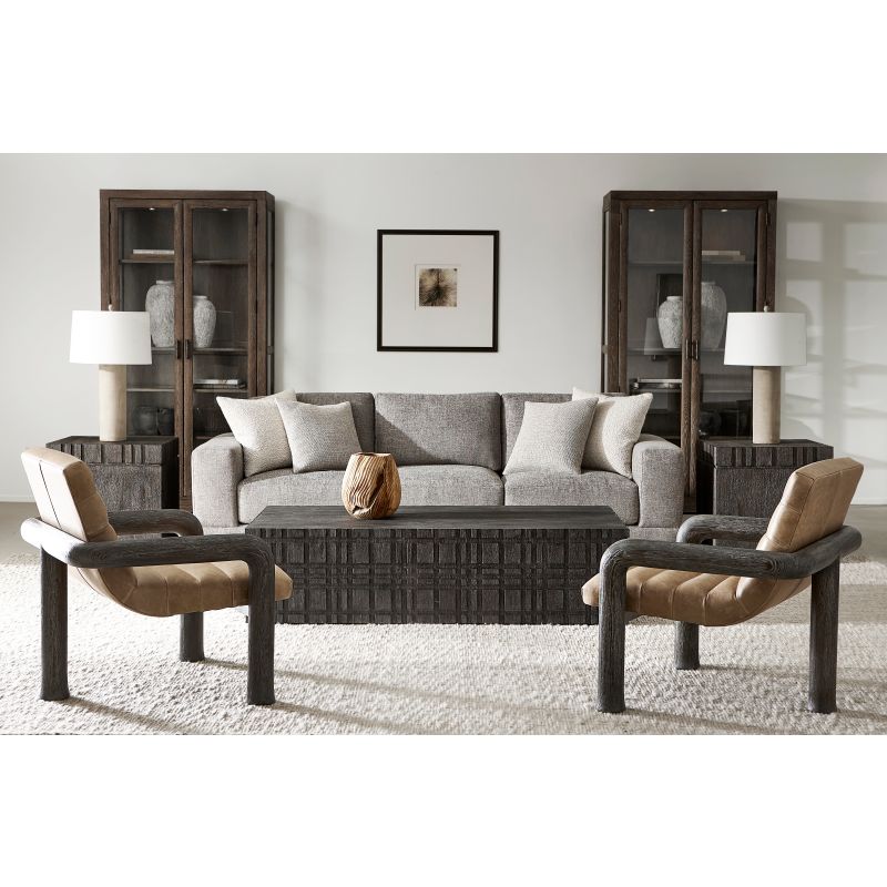 A raised geometric pattern wraps the top of the Cowley side table, giving it a unique modern style. The simple square pillar design showcases the natural wood grain in a moody Tadon finish.