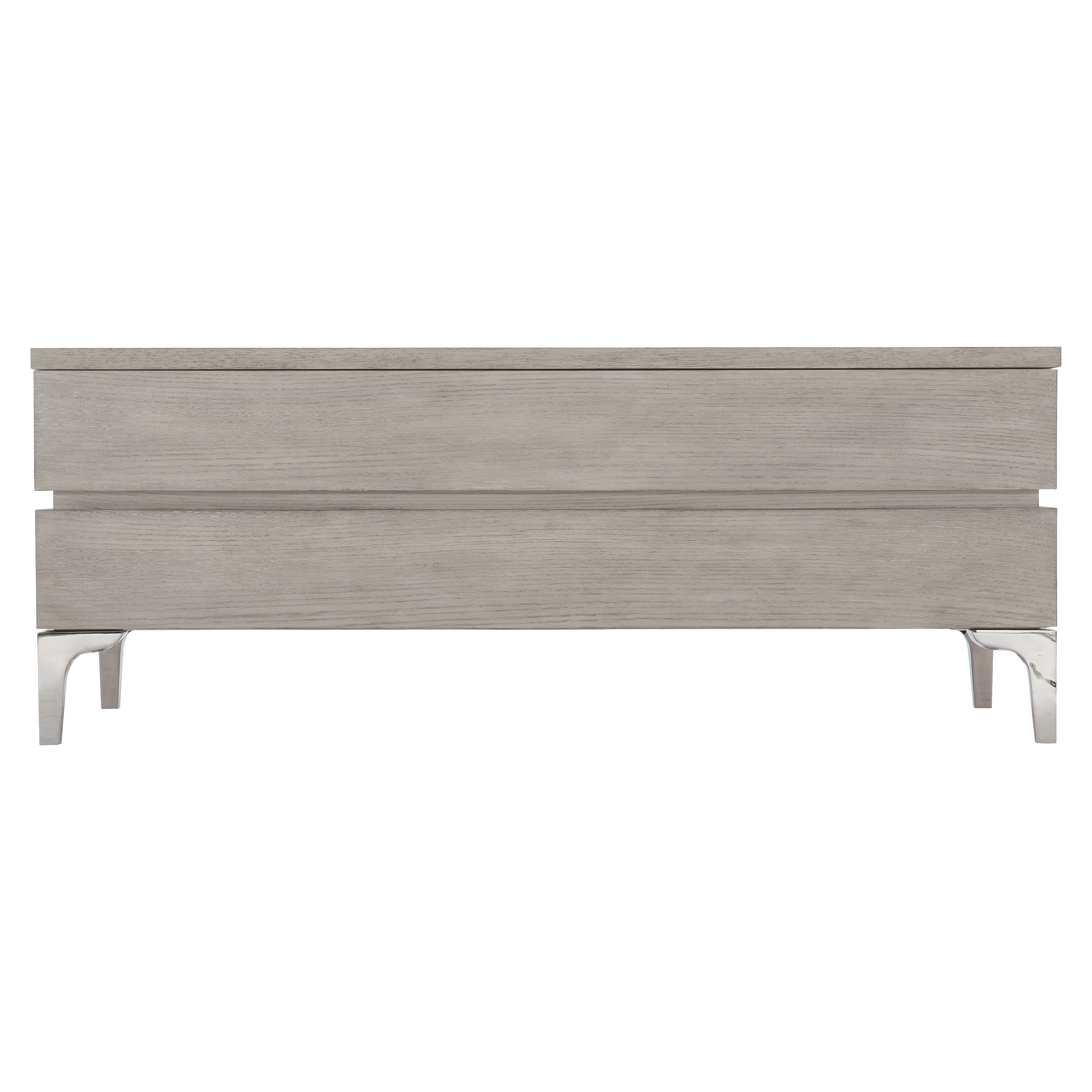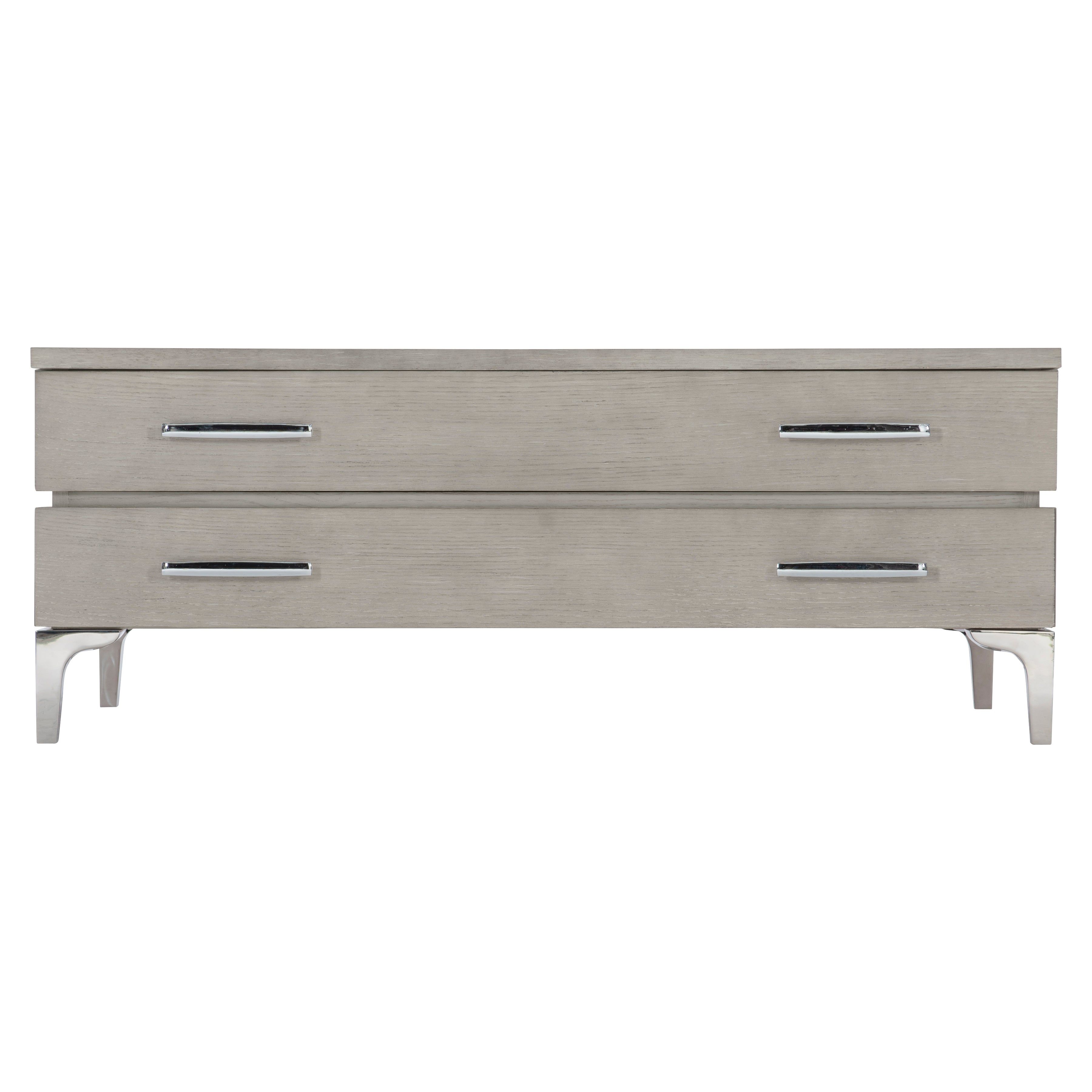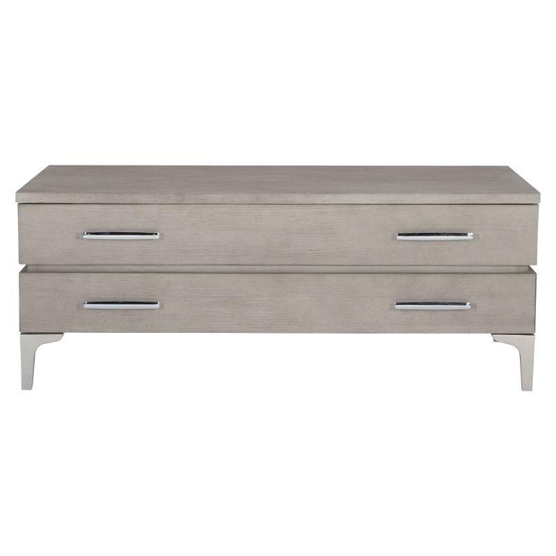 For a look of understated luxury, the Whitley cocktail table pairs bright metal accents with quartered oak veneers. A contemporary gray truffle finish highlights the linear wood grain. Polished stainless steel pulls and feet in a bright nickel finish add visual pop. Sleek and sophisticated, this transitional table features two long drawers for convenient storage.