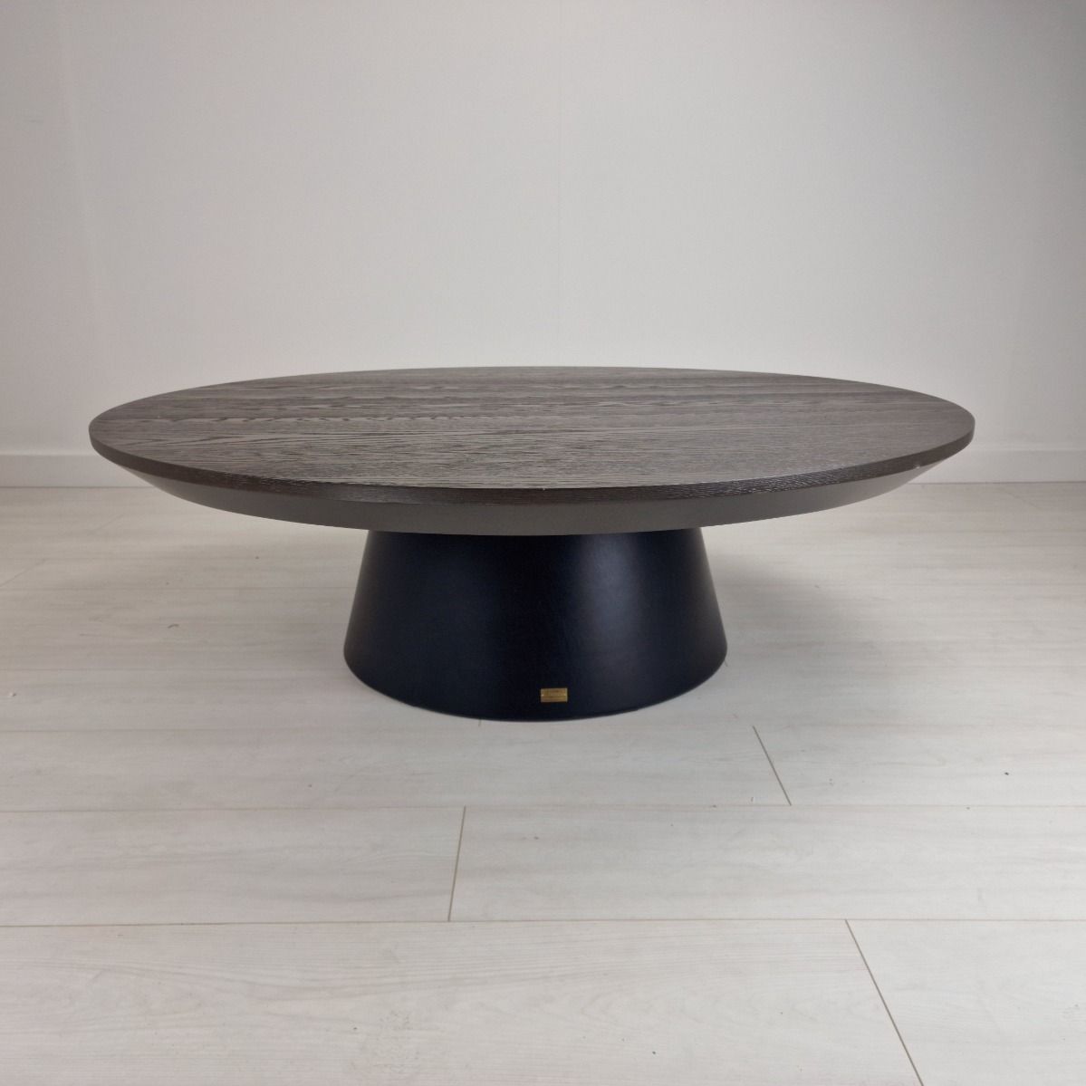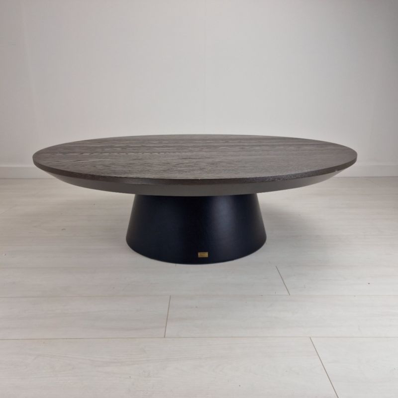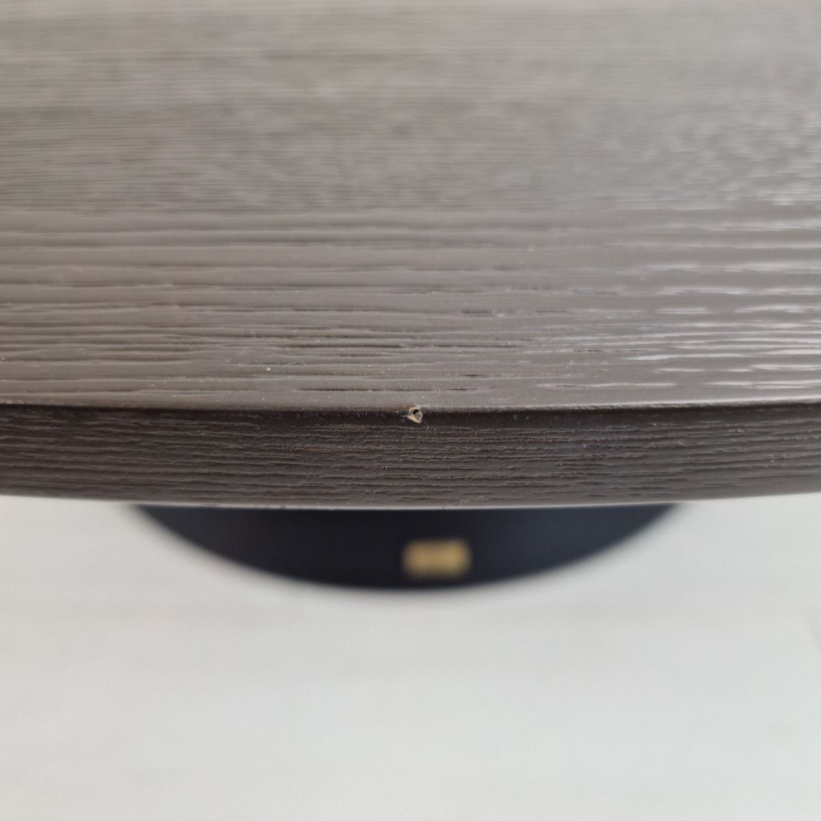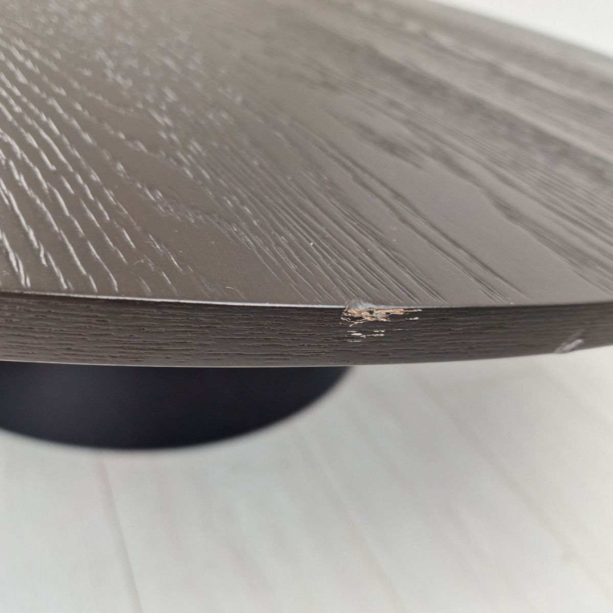 This Artwood table is designed in either all black or all dark grey; this piece is two-toned due to a mismatch, creating a unique appearance. Please note, the table has marks on the tabletop. Imperfections are to be expected - please refer to images for full details.