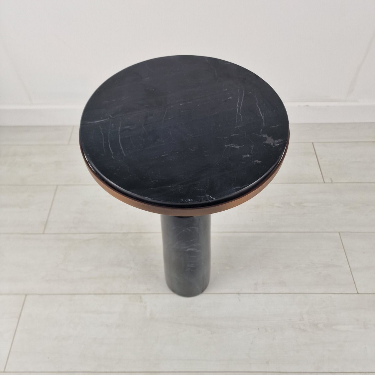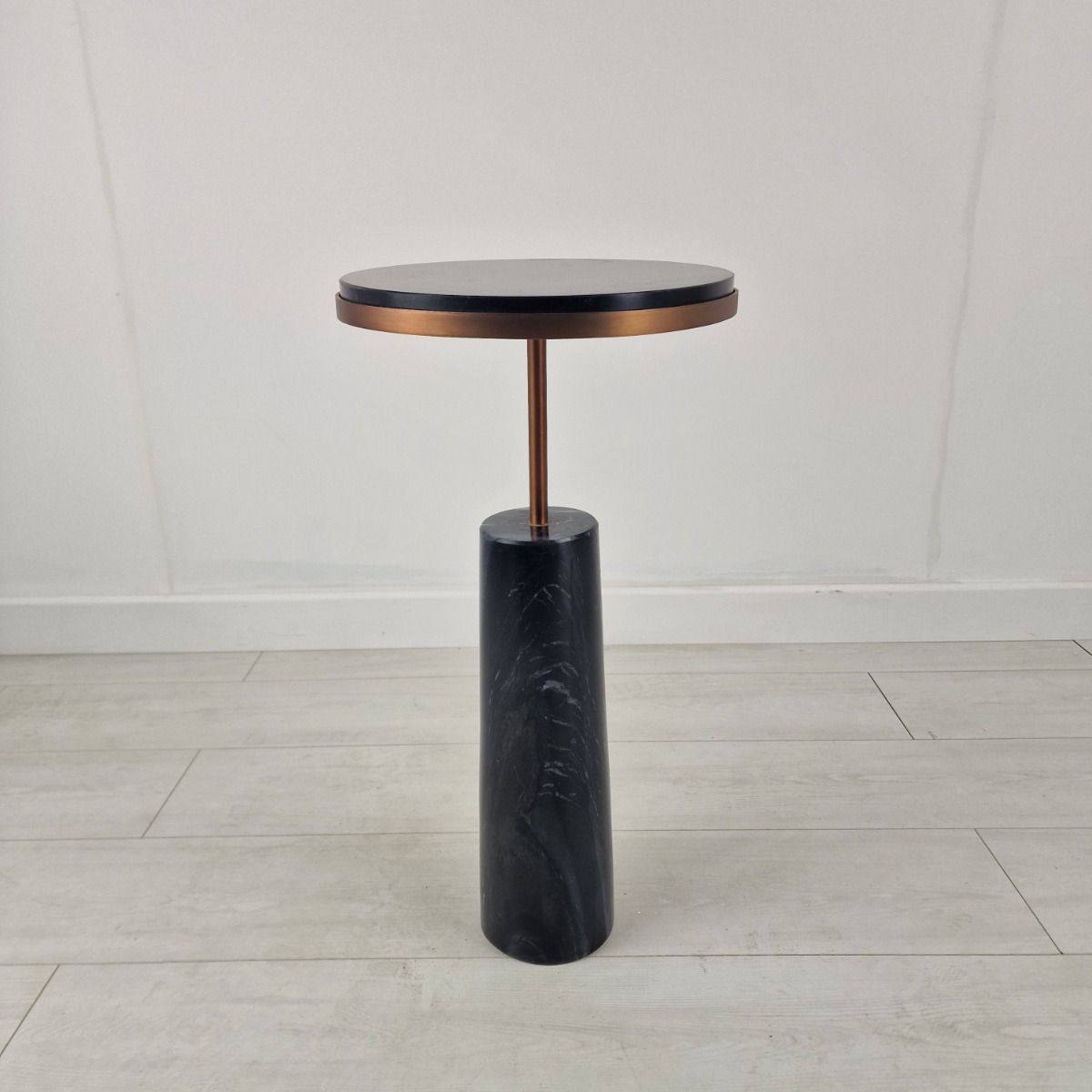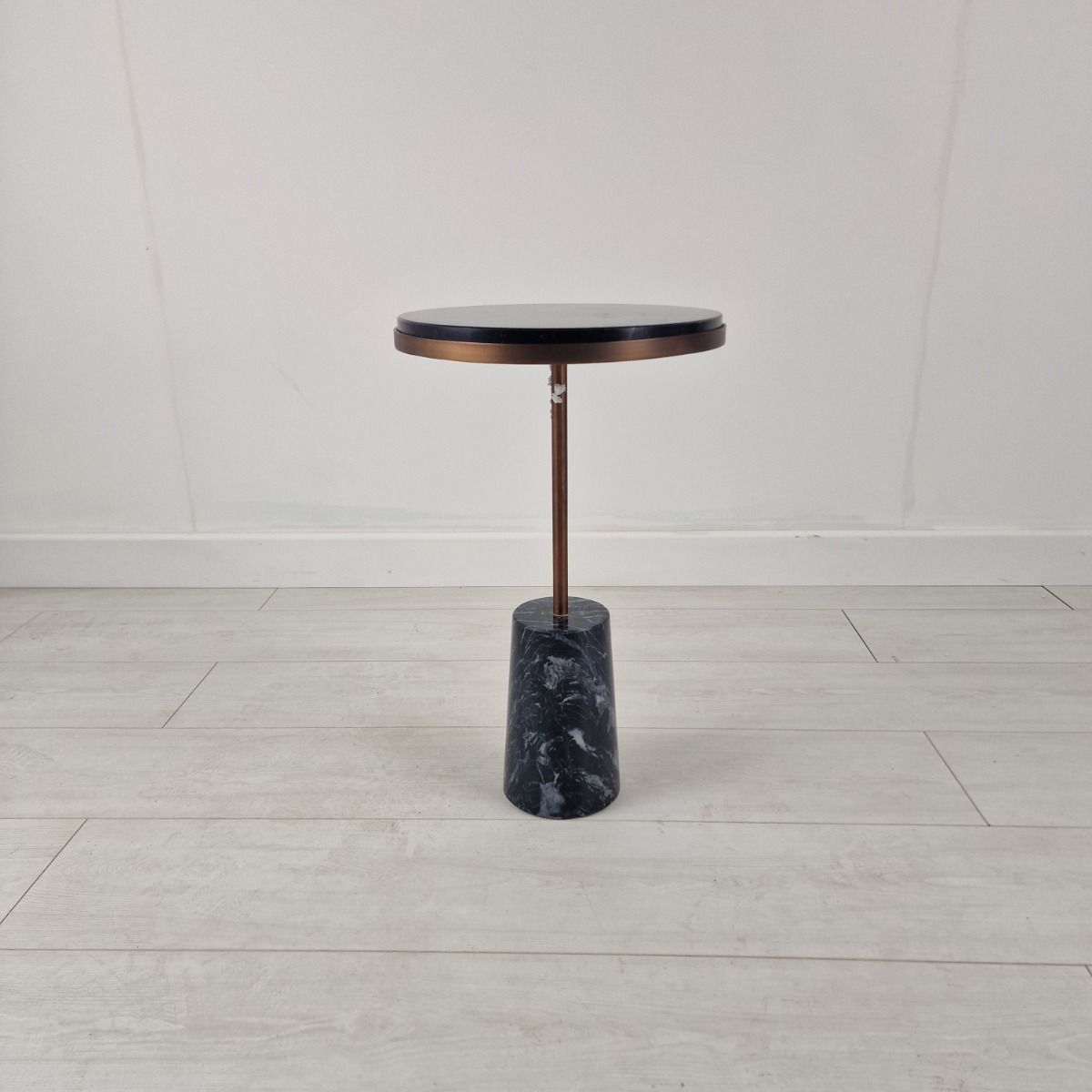 Clearance Item – Sold as Seen Black marble meets antique bronze in a rich, confident composition. A weighted base and slender stem lend a refined sense of geometry, making these tables equally at home in hotel suites or sophisticated residential interiors. The small table is in good condition. The large table has small scratches on the top surface in multiple locations – please refer to the attached images. Imperfections are to be expected, and the items are sold as...
