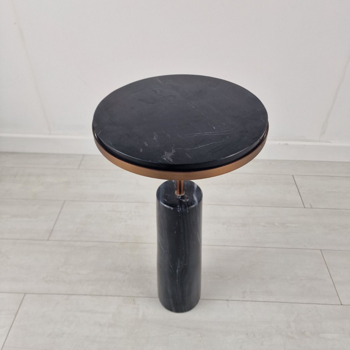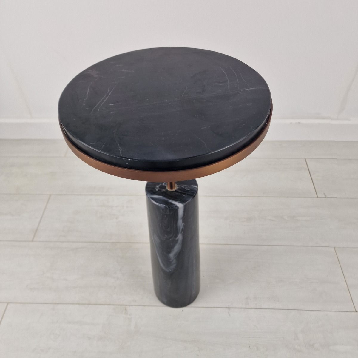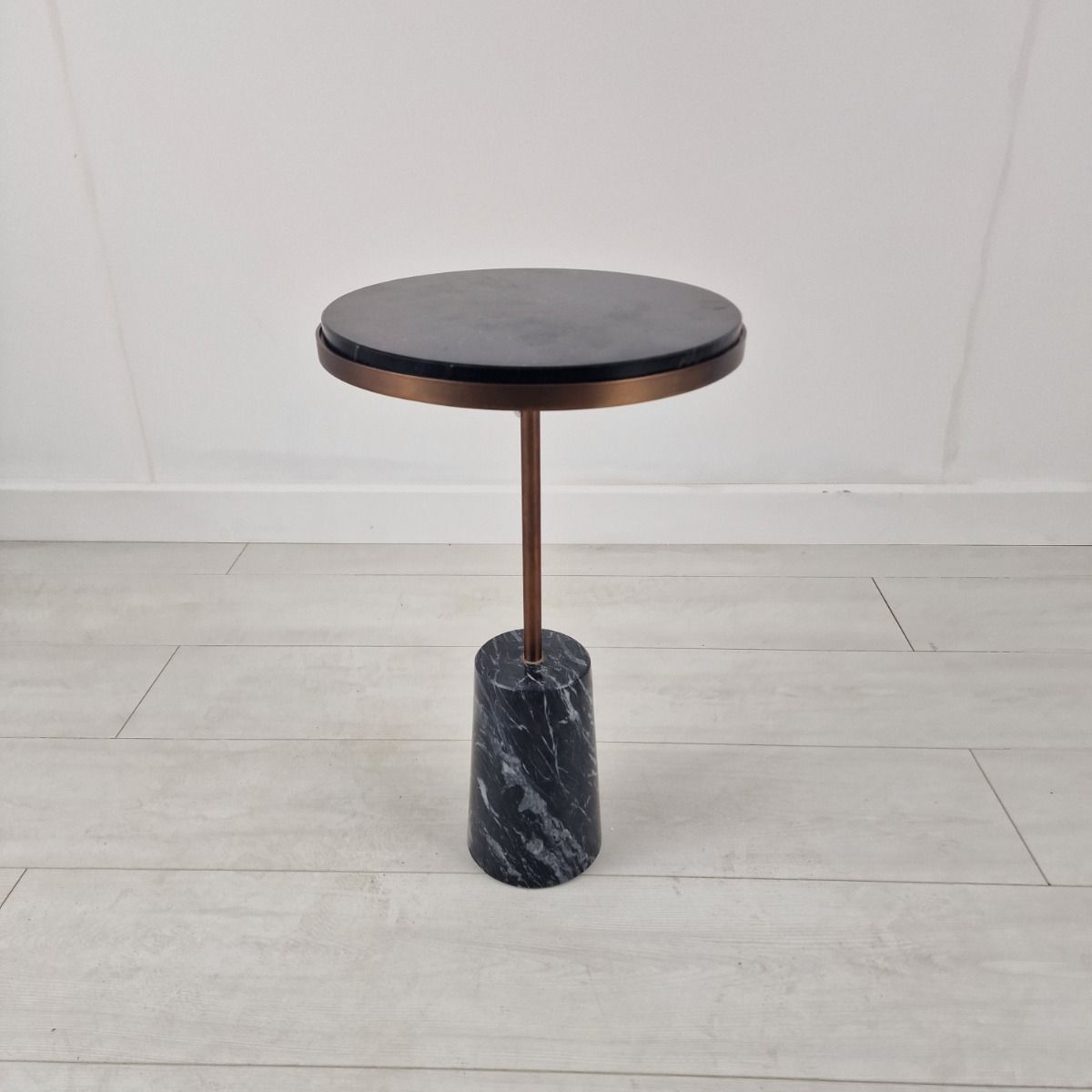 Clearance Item – Sold as Seen Black marble meets antique bronze in a rich, confident composition. A weighted base and slender stem lend a refined sense of geometry, making these tables equally at home in hotel suites or sophisticated residential interiors. The small table is in good condition. The large table has small scratches on the top surface in multiple locations – please refer to the attached images. Imperfections are to be expected, and the items are sold as...