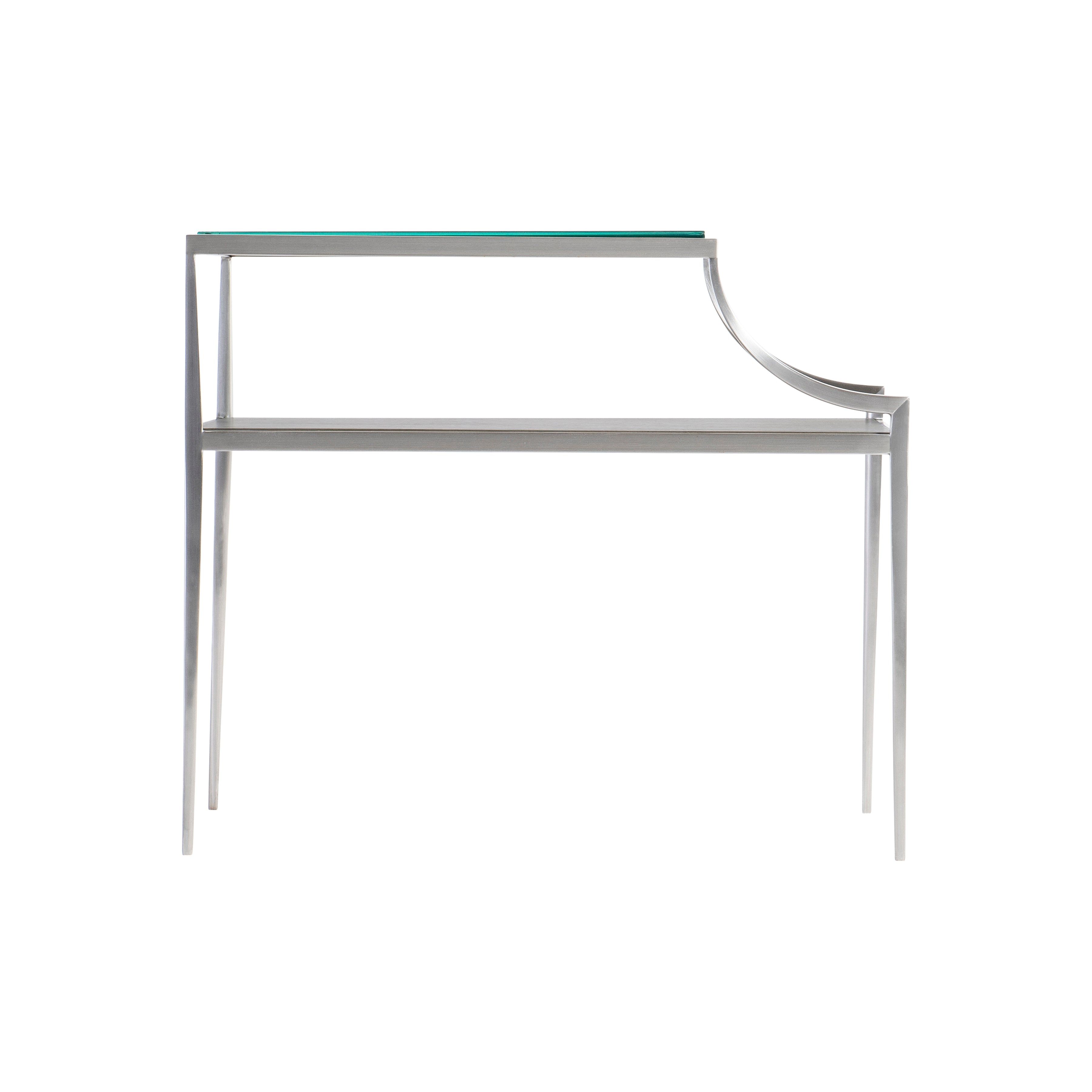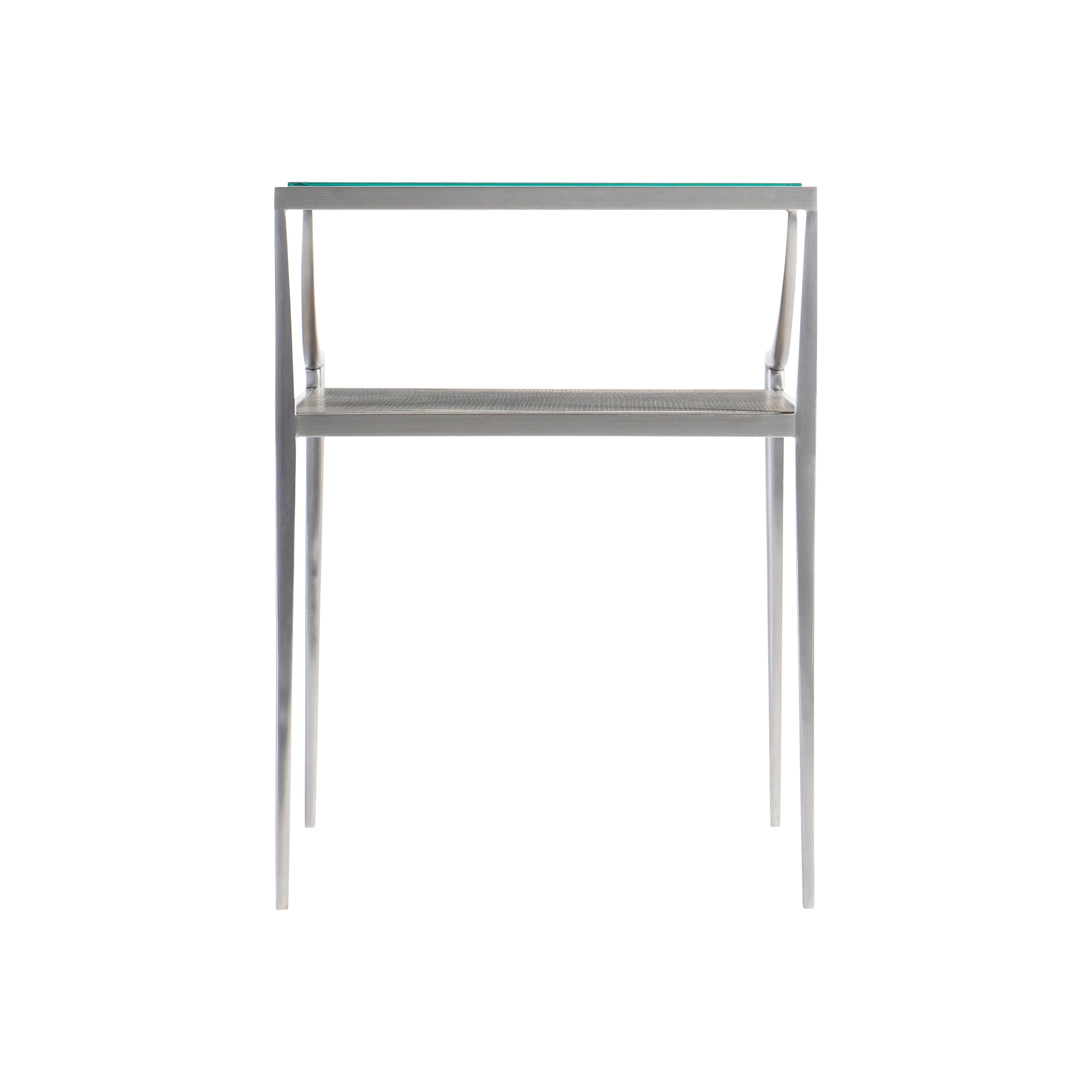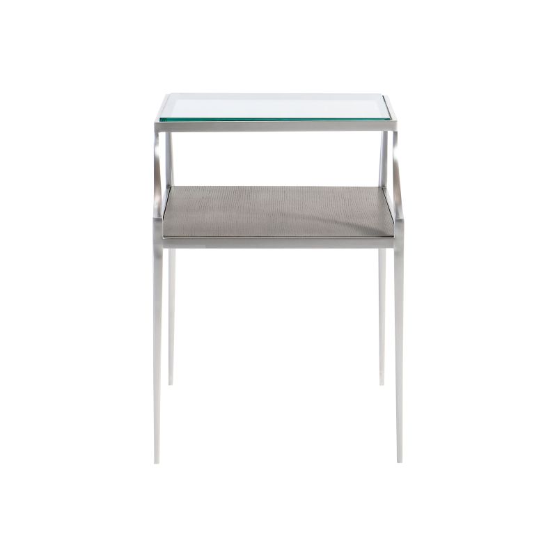 Sleek and elegant, the bi-level Cornelia side table offers a streamlined profile in cast brushed stainless steel. Slim tapered legs support a wood shelf in the Nebbia finish that extends beyond the glass top.