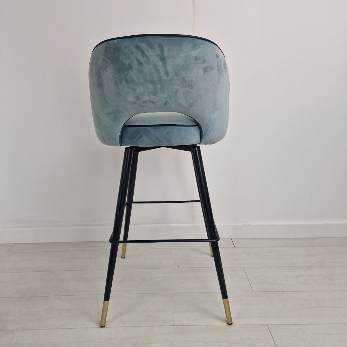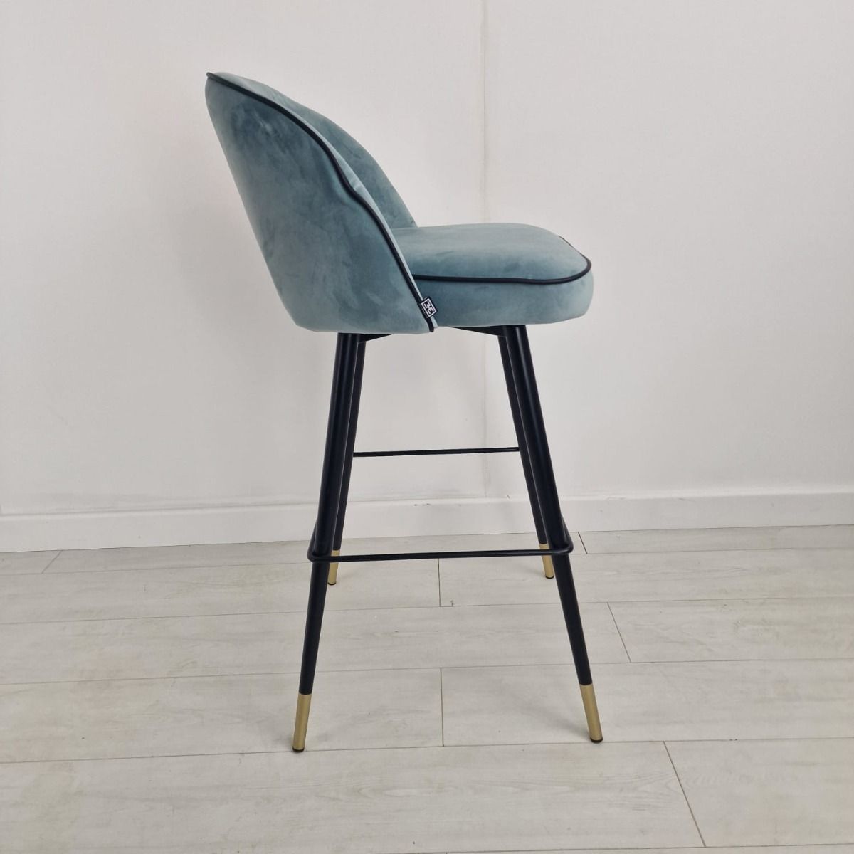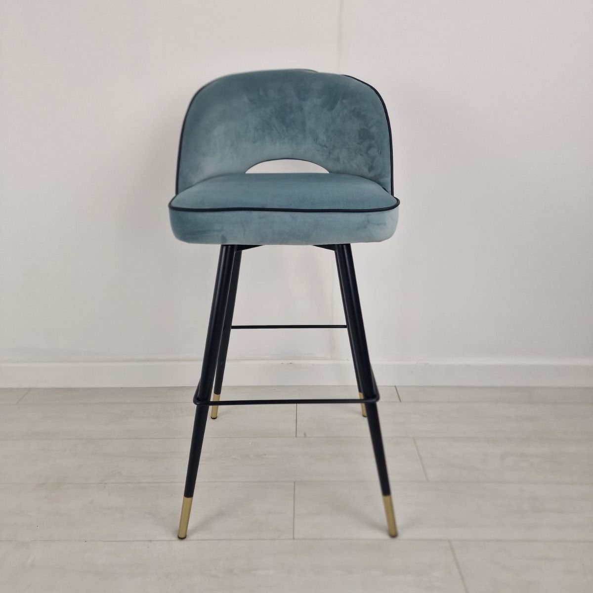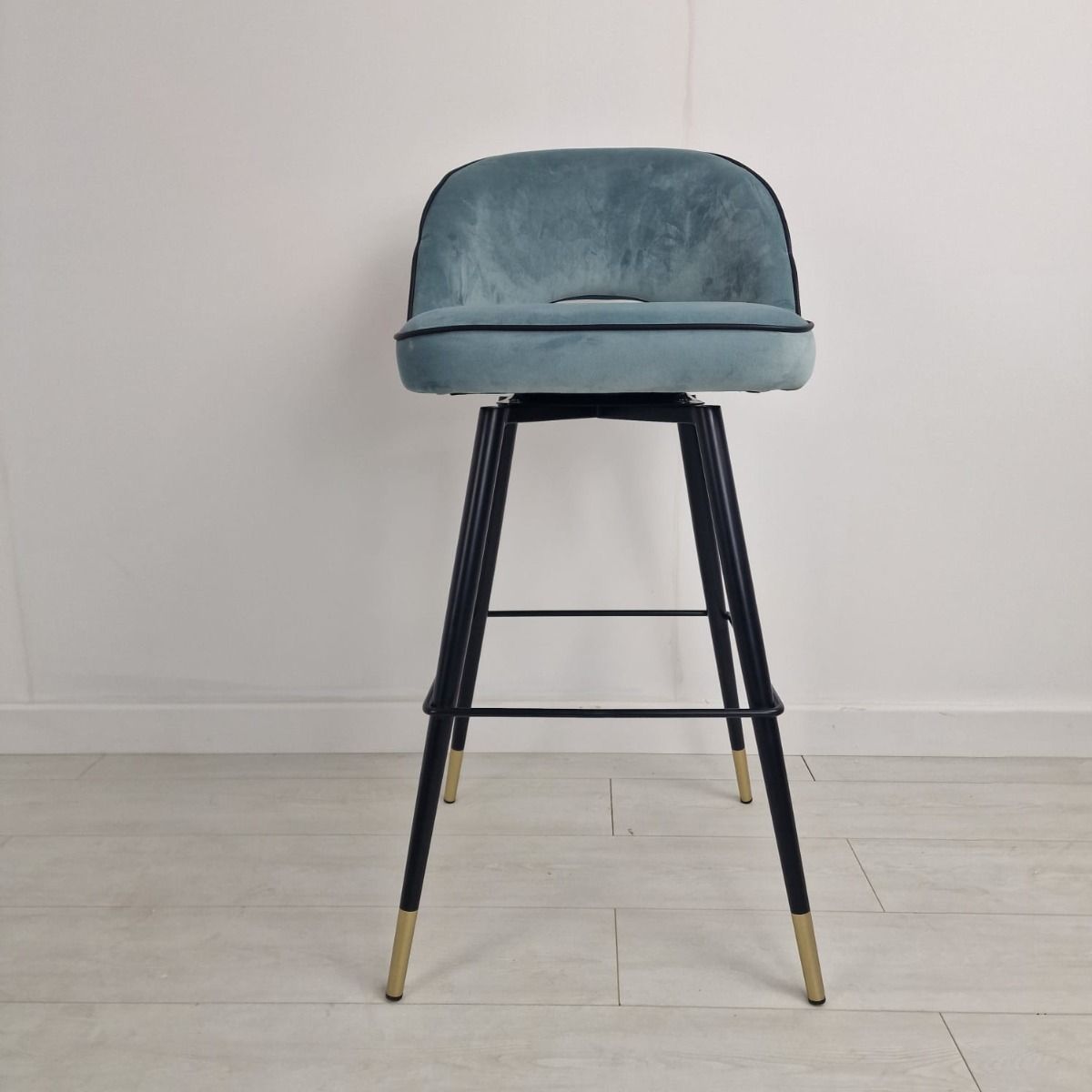 Complete your bar space décor with the elegant Cliff Bar Stool, featuring plush blue velvet upholstery, a swivel base, and...