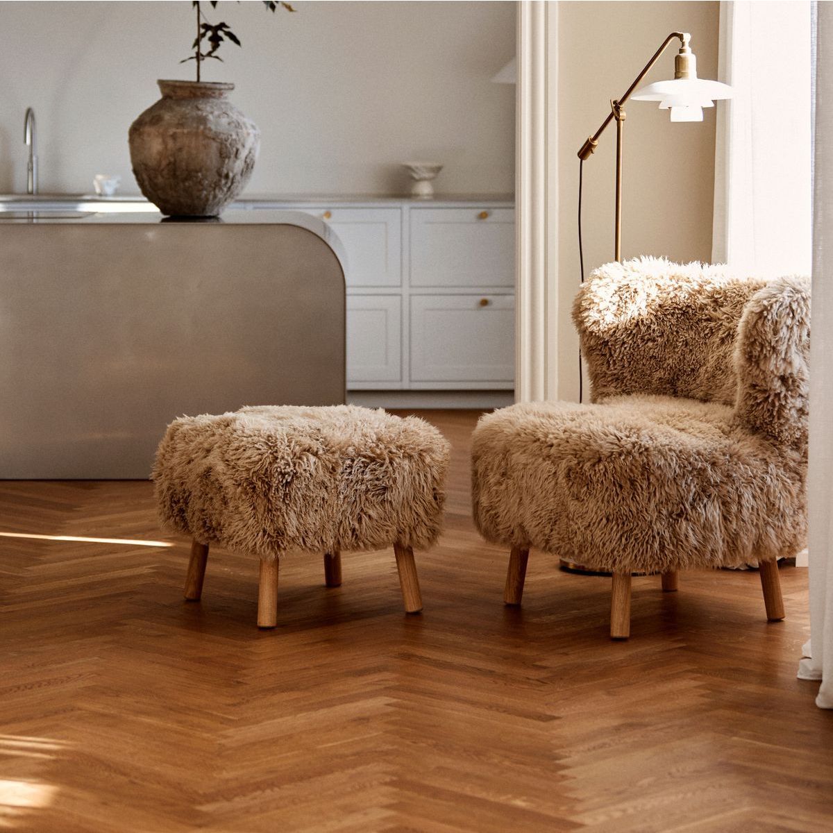 Enhance your comfort experience with our Emil Footrest Stool, designed to complement the Emil Lounge Chair. The stool is upholstered in the same enchanting lambskin pelts from New Zealand and rests on sturdy legs made of oak, walnut, or black-painted beech.