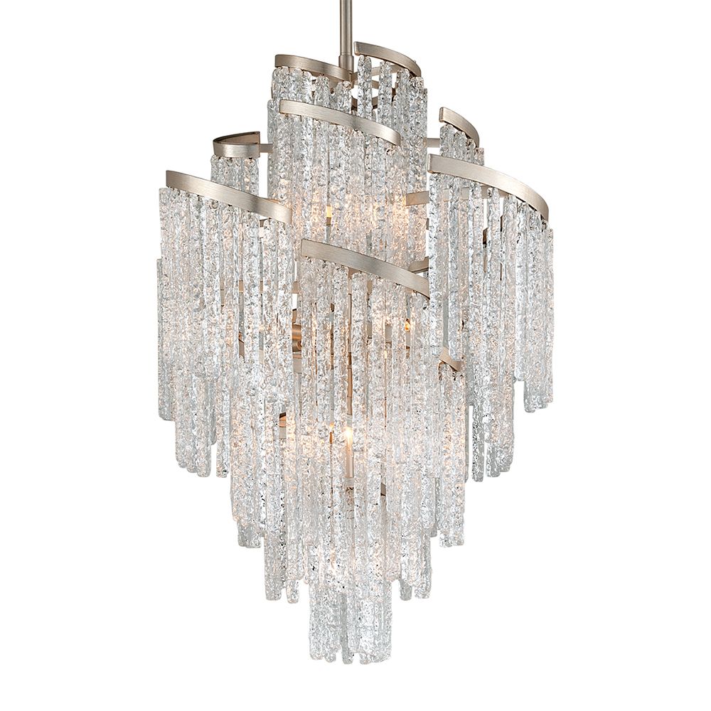 This exquisite chandelier will bring timeless beauty and elegance to your interior. The stunning Mont Blanc Chandelier consists of a modern silver leaf finish and features a waterfall of delicate, clear glass crystals giving the light a captivating icicle effect. This graceful and glamorous ceiling light will look beautiful illuminating an array of interiors.