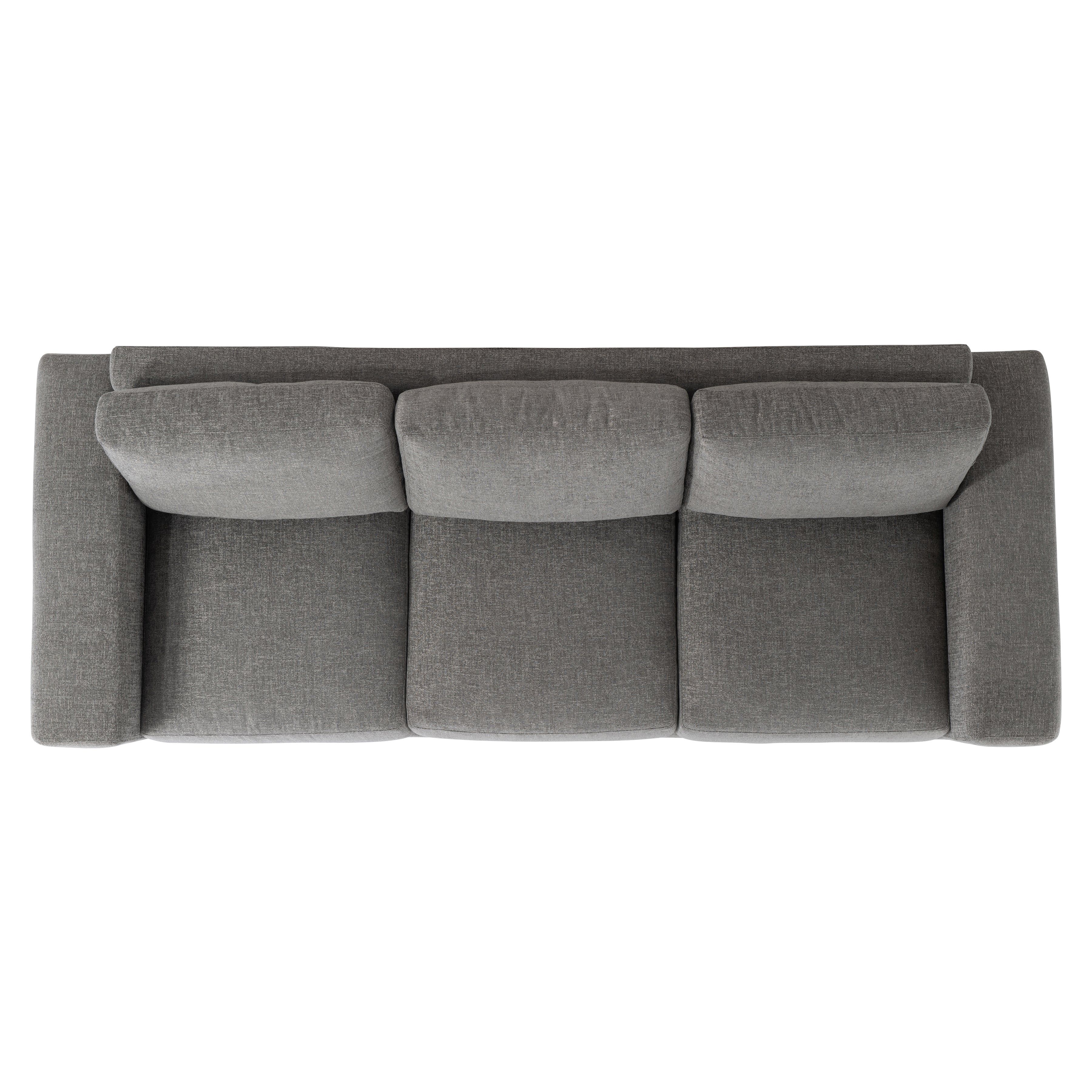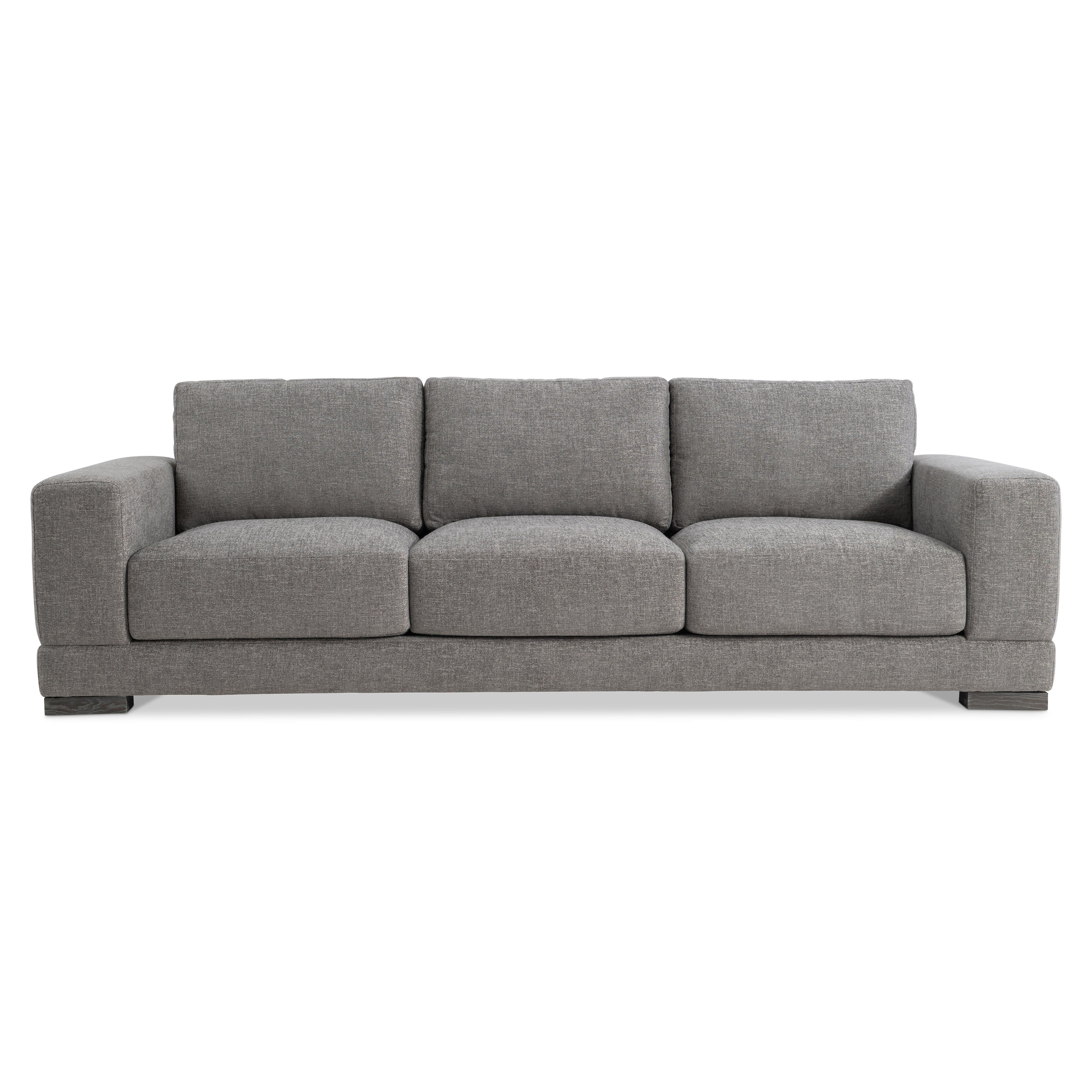 Straight lines are softened with gentle curves on the Lars sofa, complementing the wide track arms and bold silhouette. Plushly deep seat cushions and box-edge weltless bordered back pillows craft a comfort destination on four wide block wooden feet.