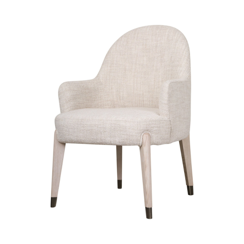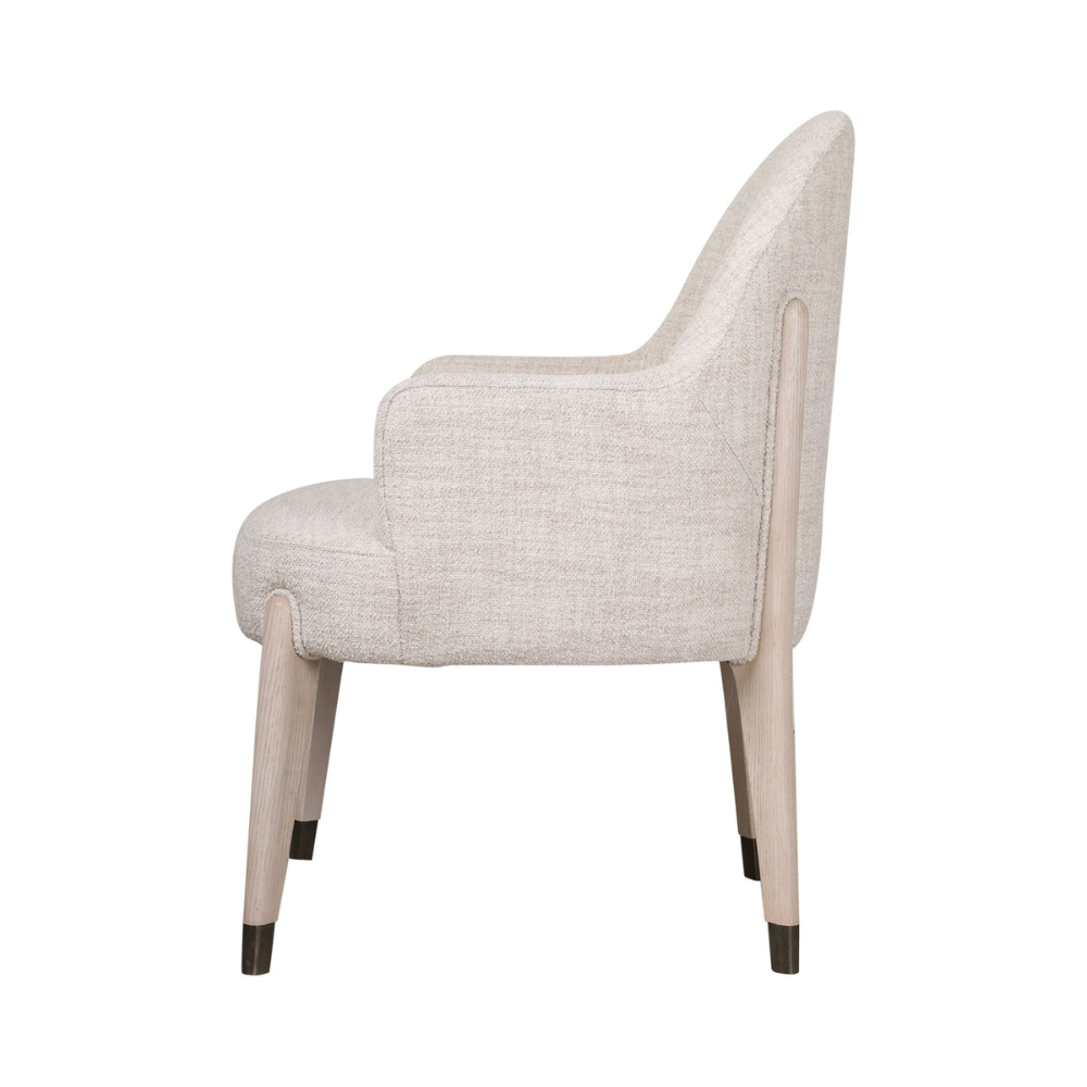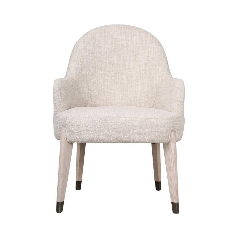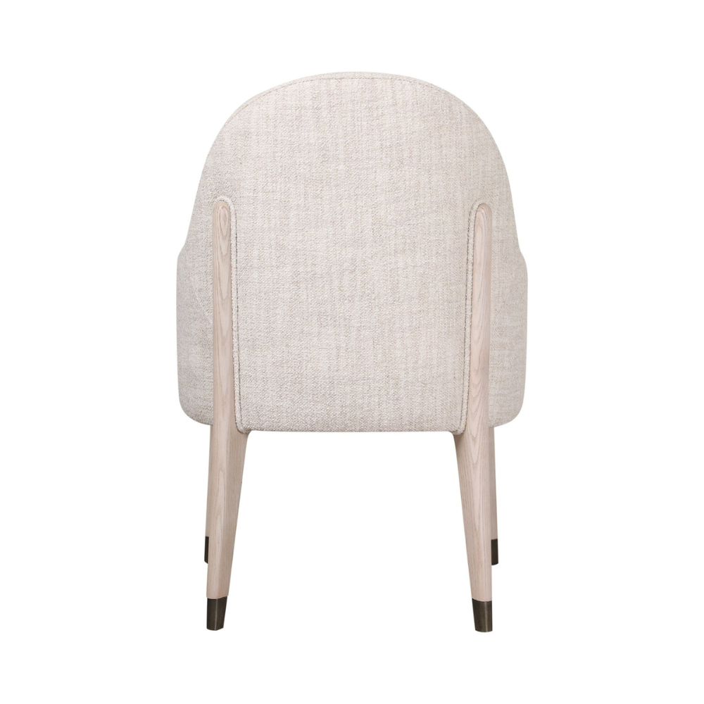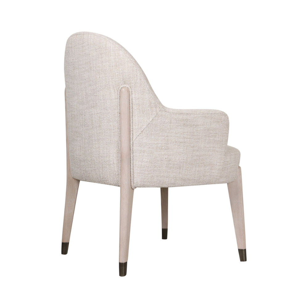 Shaped with languid contours and soft poise, the Luna Dining Arm Chair II in Light radiates an airy elegance. Sculpted from oak and finished in a pale Cascade tone, its frame captures lightness without sacrificing warmth. Metal caps in deep brown add a refined punctuation to the legs, lending a modern edge to its understated silhouette.