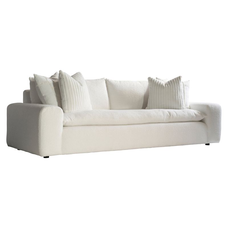At almost 100 inches wide, the Nikki sofa boasts a generously sized frame and comfortable style. A single bench pillow runs the length of the frame, finding support in the base. Two knife-edge back pillows offer plush luxury, while rounded arms and two (2) throw pillows invite lounging and relaxing.
