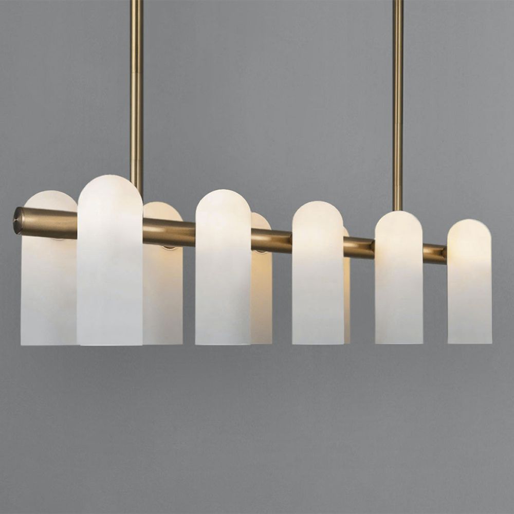 Transform your space with the effortlessly chic and opulent Odyssey Linear Chandelier by Schwung. A captivating colonnade of translucent glass is hung elegantly on the solid natural brass fixture, creating a cosy but sleek, luminous environment.